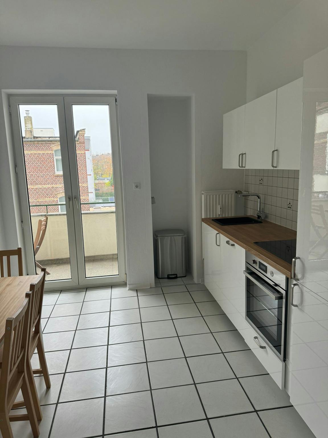 This luxury room offers a comfortable double bed, a stylish nightstand, and a modern, minimalist decor complemented by soft wood flooring and a beautiful closet. A large window and glass door let in natural light and lead to a private balcony furnished with a table and chairs, perfect to relax outdoors. Moreover, one has a panoramic view on Luegallee, which is one of the most exclusive streets in Düsseldorf. The kitchen is bright and well-equipped, featuring a clean white finish, modern appliances, and a dining area with seating for four, making it ideal for preparing and enjoying meals. Also the kitchen is connected to a private balcony. The bathroom is spacious, tiled in a classic white and gray pattern, and includes a full bathtub, a shower, and a sleek sink, providing a serene space to unwind. Moreover, the washing machine can be found in the bathroom.