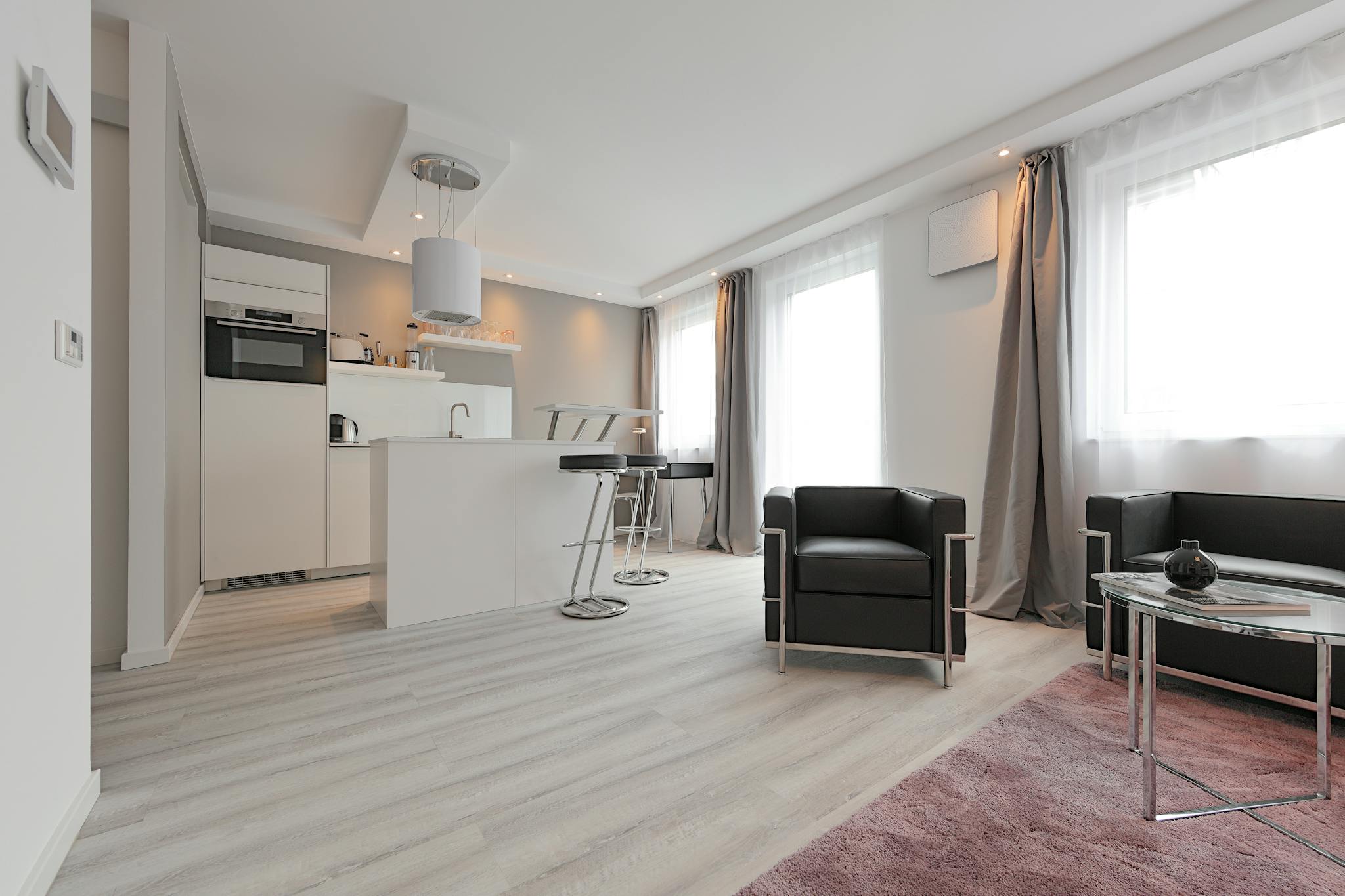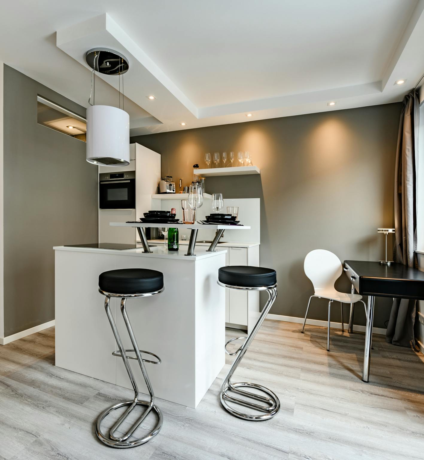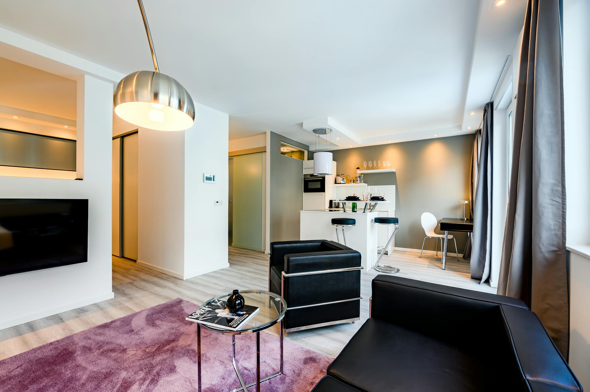 Arrive and feel right at home, use the elevator up to the fourth floor and open the door to your new home with a transponder or from an app. All other functions like lighting, heating, shutters and much more you can easily and quickly control via the app or one of the two wall panels (SmartHome system). Relax on the Le Corbusier style designer sofa or the lounge chair, with a cozy carpet under your feet, and make best use of the large smart TV. A desk with a view offers enough space for your laptop and working materials, surfing with high speed internet.