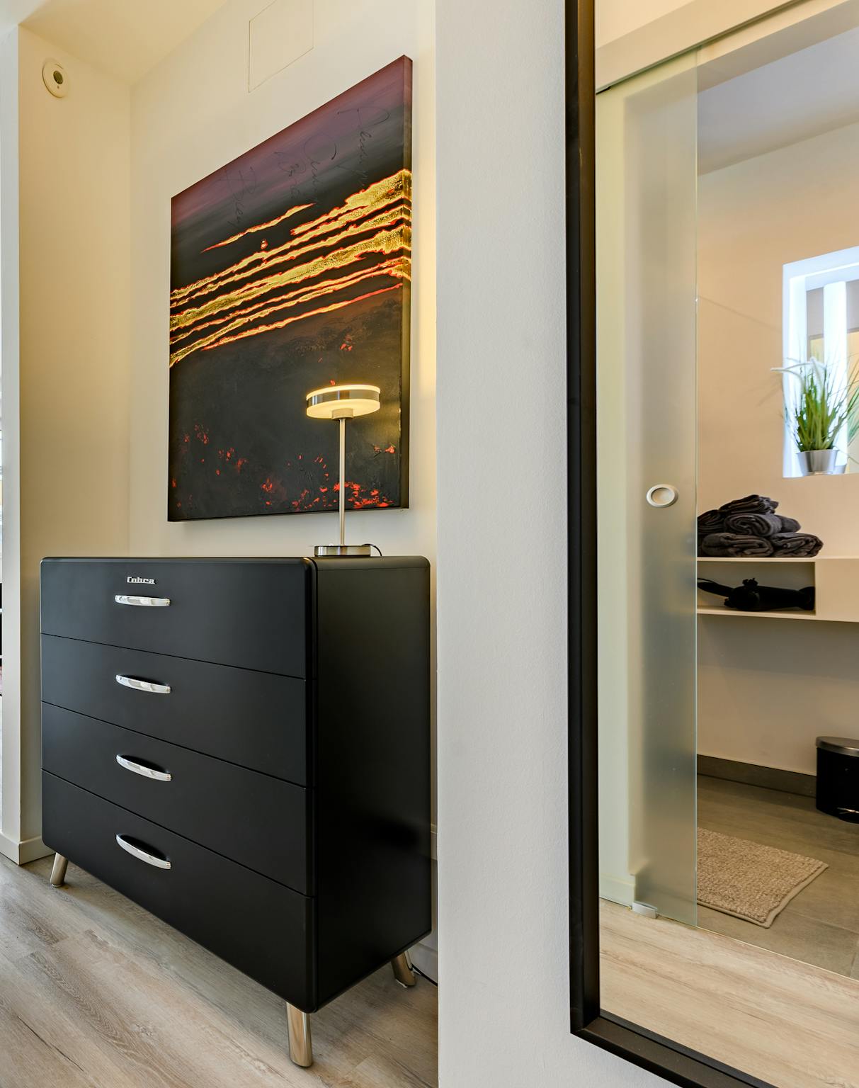 The separated bedroom has a high quality boxspring bed (Queensize, 160x200 cm) with plenty of storage underneath as well as a large build-in closet. It is equipped with allergy friendly bedding, adaptable to summer and winter times. From there, you can very comfortably watch TV, stream or play with the second large smart TV in the wall niche right in front of you.