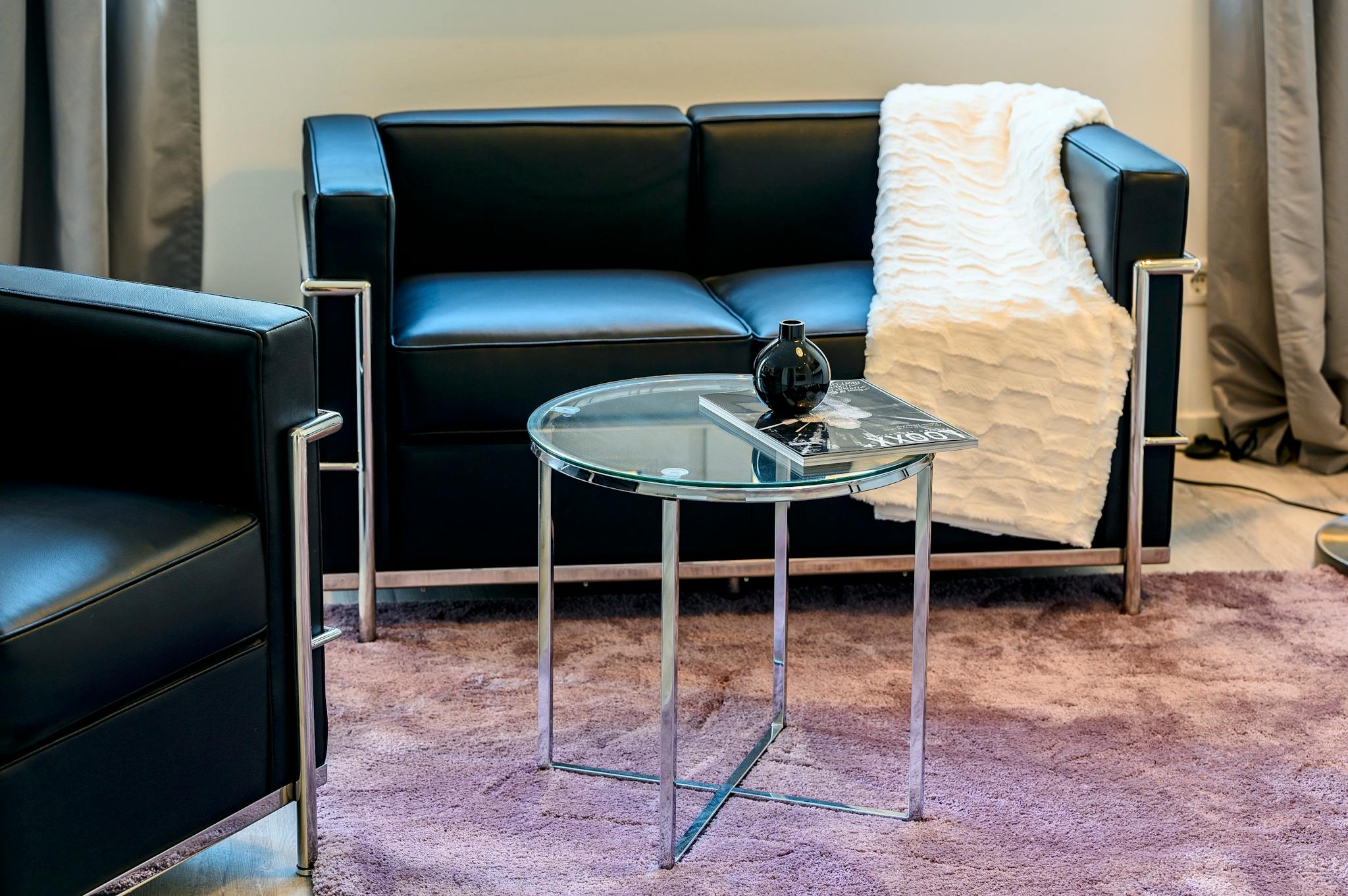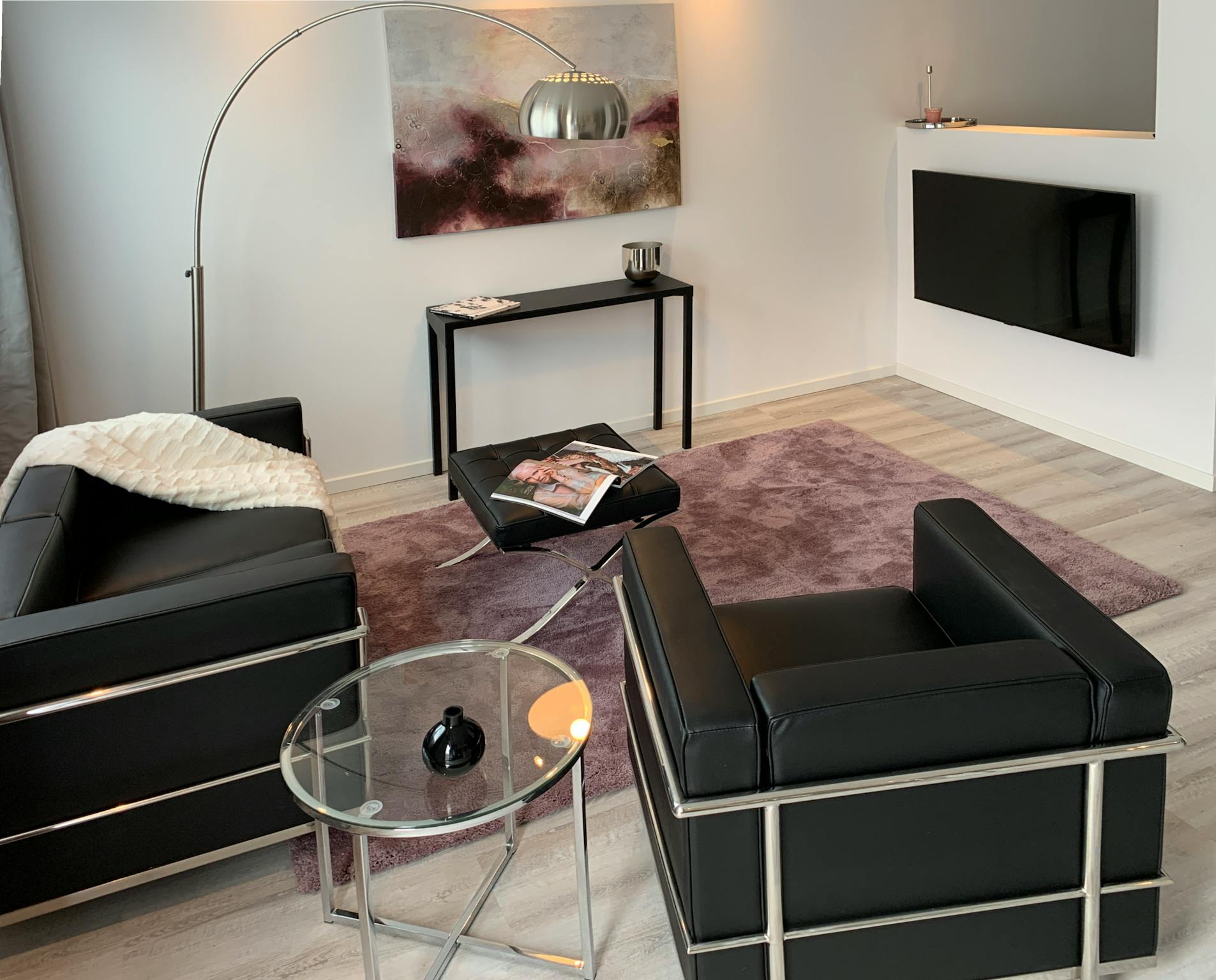 Elegant im Le Corbusier-Style mit schwarzem Leder Sofa, Sessel und Ottoman mit Chrom-Akzenten, klare Linien, super komfortabel. Das hochwertig eingerichtete Apartment eignet sich ideal für 1 oder 2 Personen.