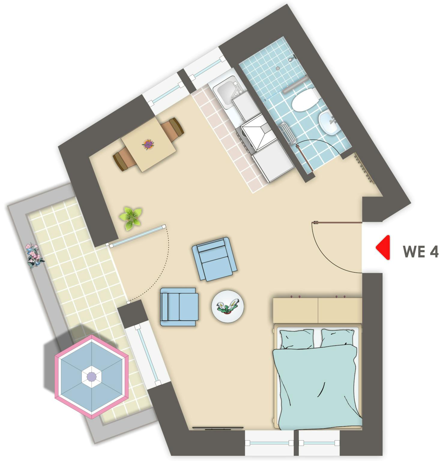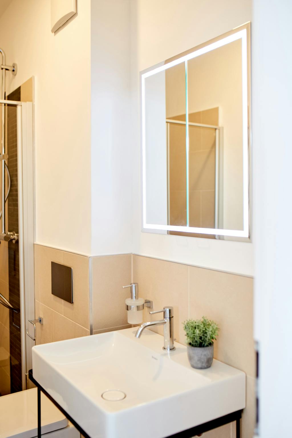 The comfortable apartment has an open-plan living area with fitted kitchen, contemporary desk, dining table with two comfortable chairs and a cosy couch on which to relax. You'll just love cooking in the fully equipped open-plan kitchen. The contemporary and fully refurbished bathroom with shower with rainfall head and integrated mirrored cabinet leaves nothing to be desired. There is plenty of space for stowing your belongings in wardrobes and built-in cupboards while there is a reserved storage space in the communal area on the first floor...