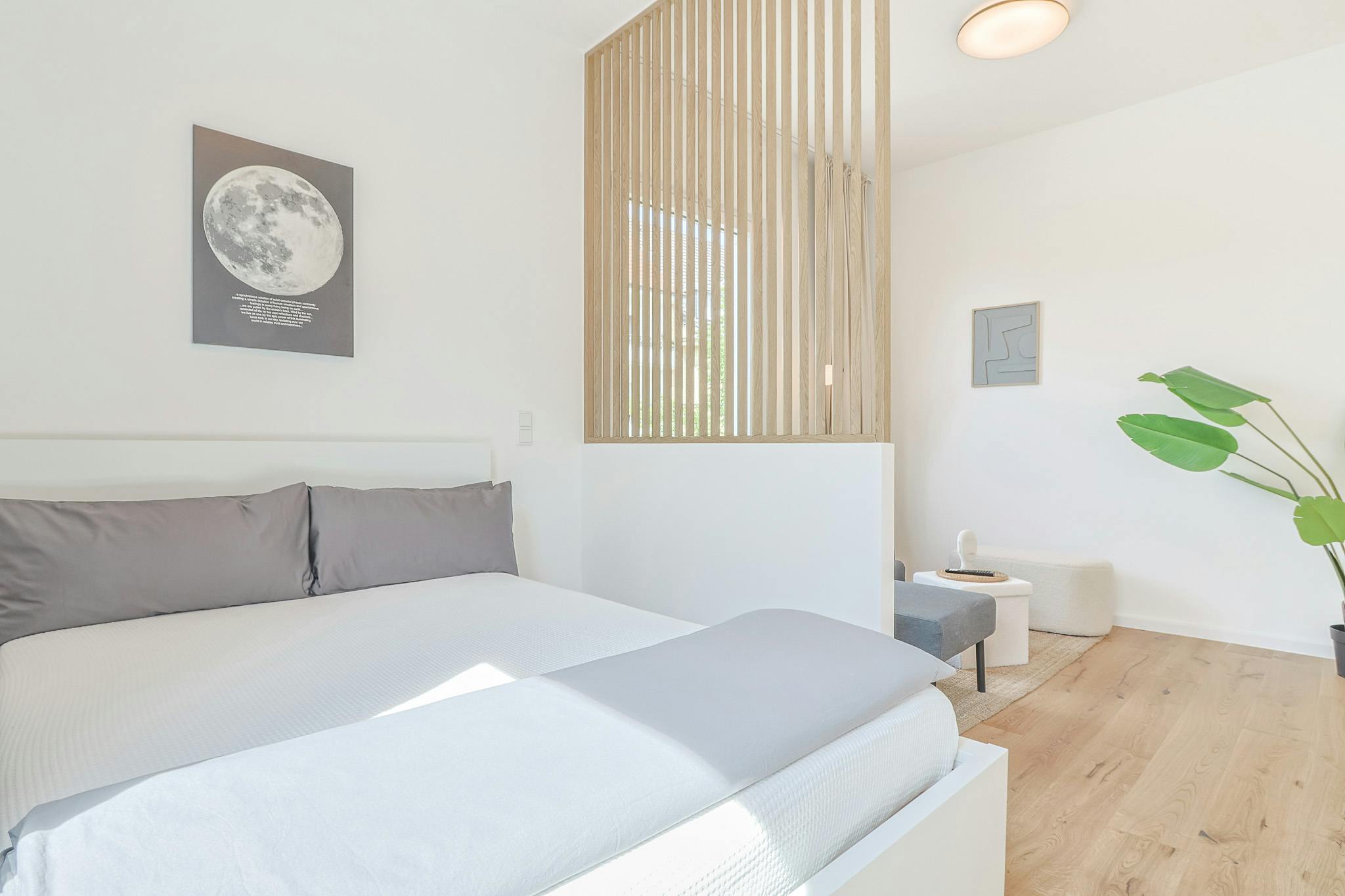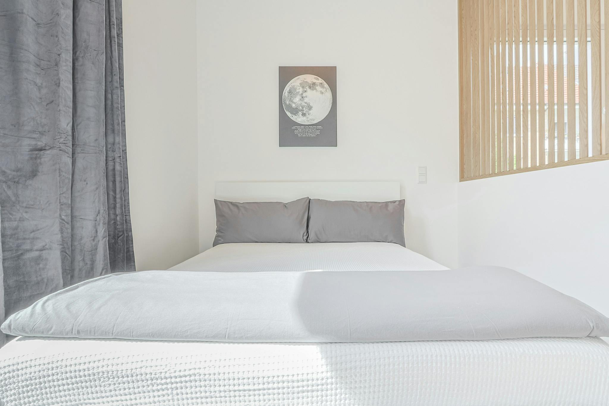 Der Schlafbereich verfügt über ein 140er Bett und einem geräumigen Kleiderschrank.