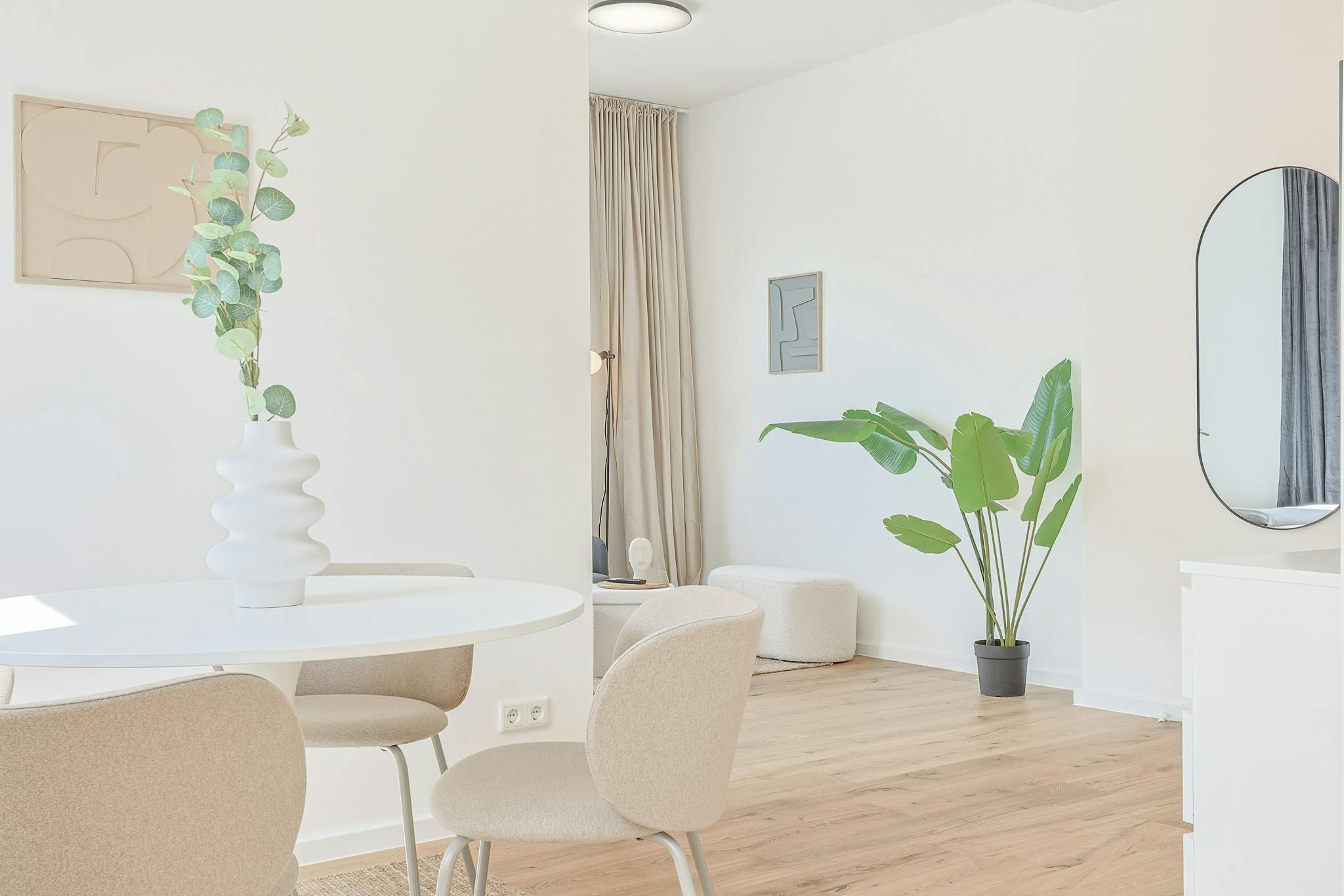 Die stilvoll eingerichtete Wohnung verfügt über einen Wohn.-Essbereich mit integrierter Küche.