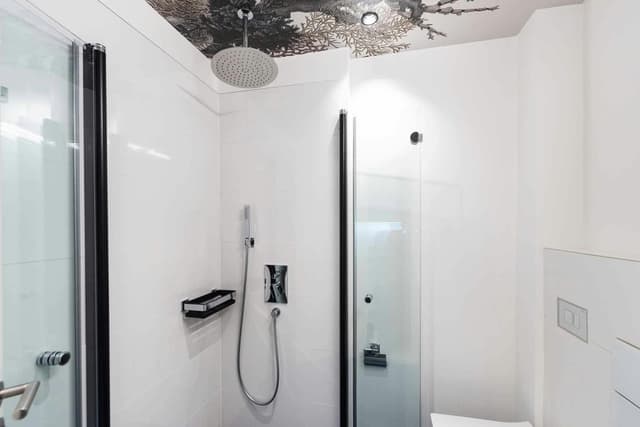 The private kitchen is fully equipped with Siemens appliances, including a dishwasher, ceramic cooktop, microwave, and Nespresso machine—ideal for preparing meals at home. The bathroom stands out with artistic ceiling accents and a sleek finish.
