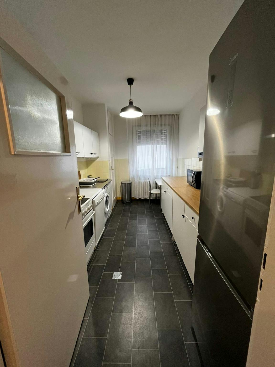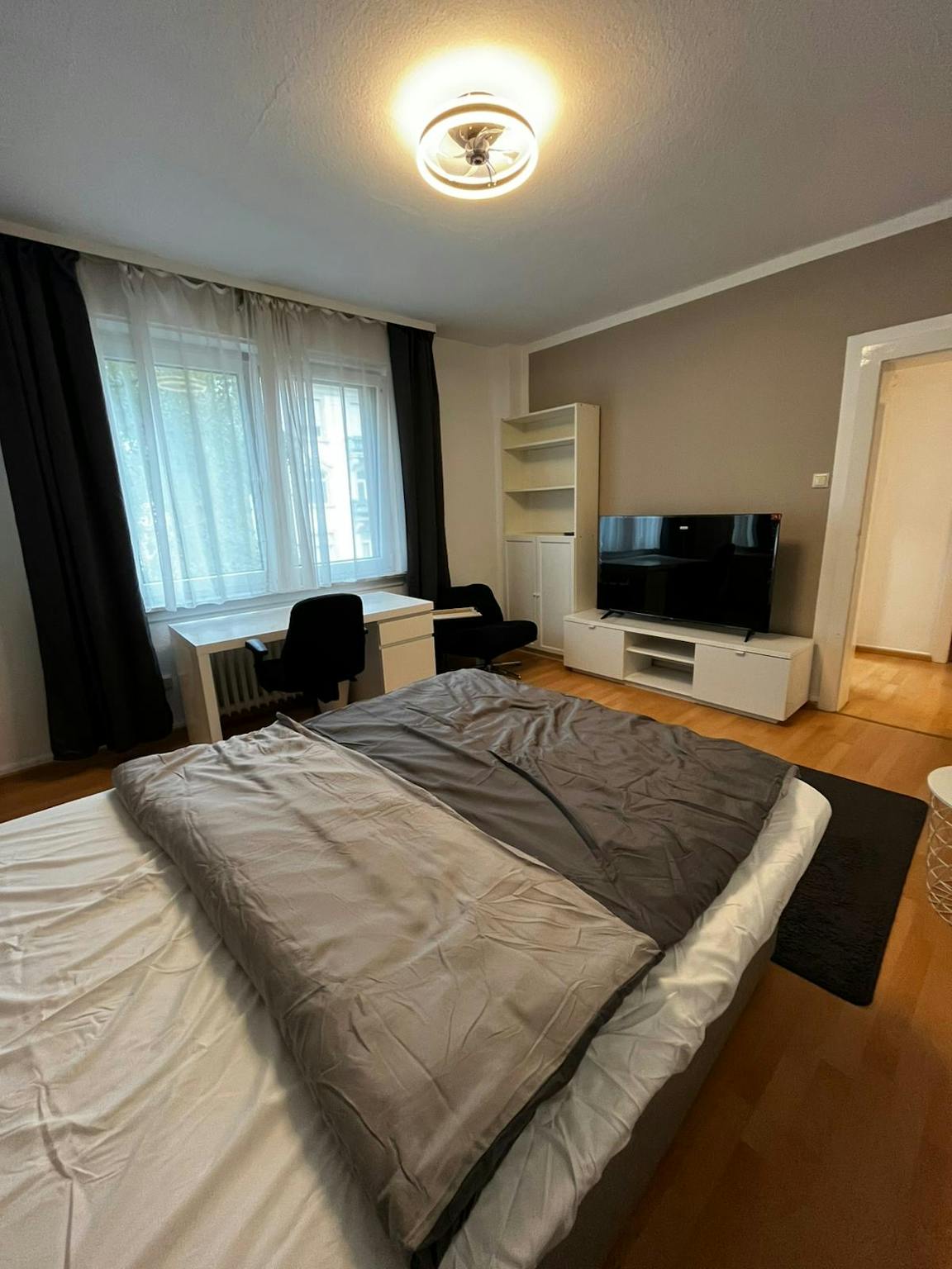 Außerdem findest Du einen Kleiderschrank für Deine Garderobe, einen Tisch und Stuhl für Arbeit oder Studium, ebenso wie einen SMART TV (55 Zoll) für Deine Unterhaltung. Die Küche ist perfekt, um hausgemachte Mahlzeiten zuzubereiten. Teil der Ausstattung sind Waschmaschine mit Trockner-Funktion und Spülmaschine.