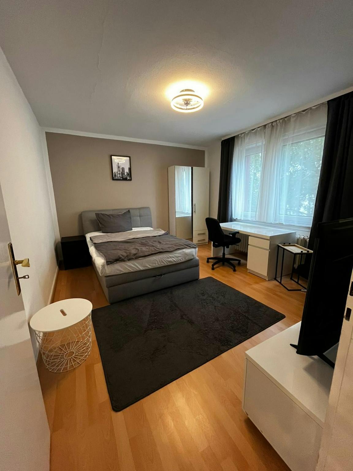 Ein großzügiges und praktisch eingerichtetes WG-Zimmer schafft eine „Wohlfühl“-Atmosphäre, sobald Du das Zimmer betrittst. Für einen erholsamen Schlaf steht Dir ein Boxspringbett mit den Maßen ca. 1,40m x 2,00m zur Verfügung.