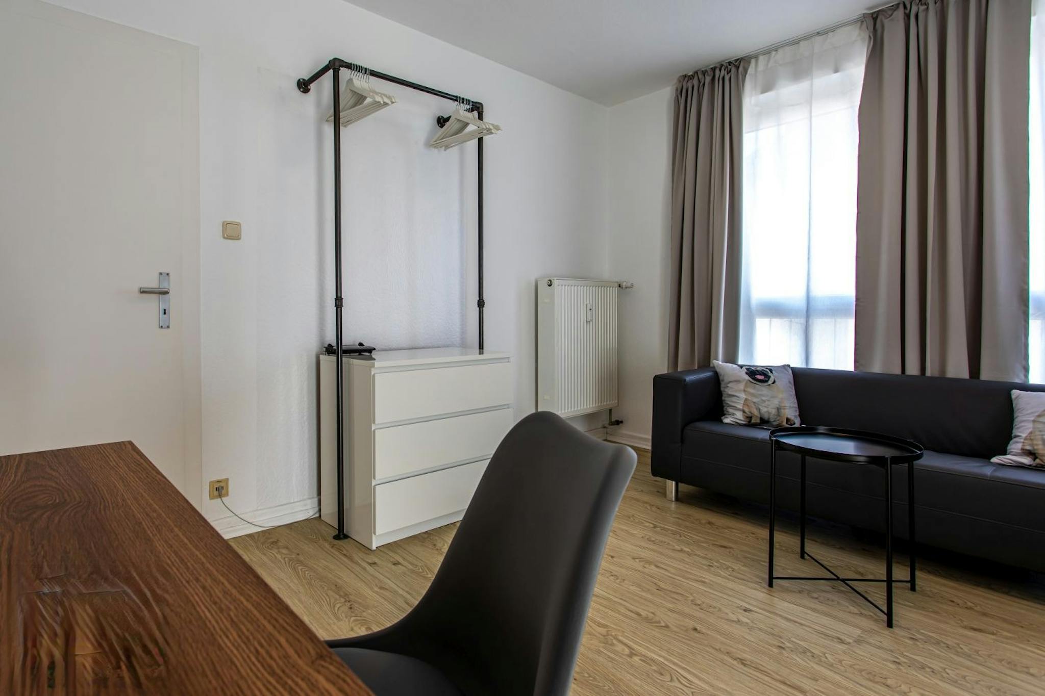 Das große Wohn-/schlafzimmer des Apartments ist neu und modern eingerichtet mit einem 1,40m Boxspringbett mit Nachttisch, einem Doppelsofa, offenem Kleiderschrank mit Kommode, einem Schreibtisch mit Stuhl und Lampe, sowie einem Fernseher an der Wand. Hier gelangt man auch zu dem kleinem Balkon.