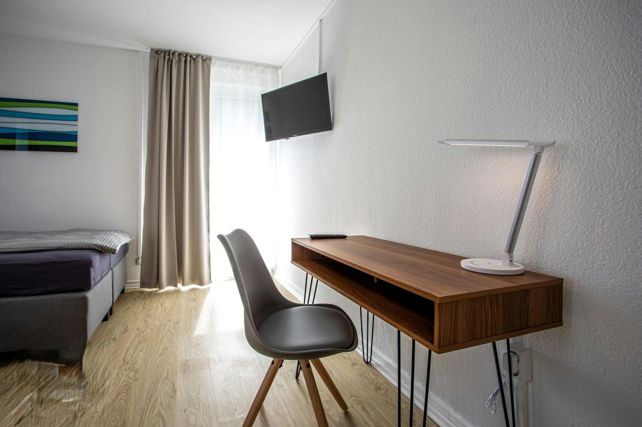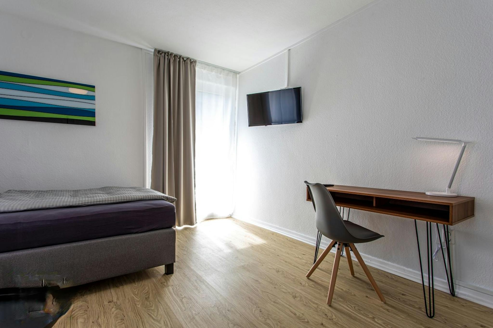 The apartment is modernly furnished with a 1.40m boxspringbed, 2-seater sofa, open wardrobe, desk with chair, bedside table and TV. Also it has a balcony.