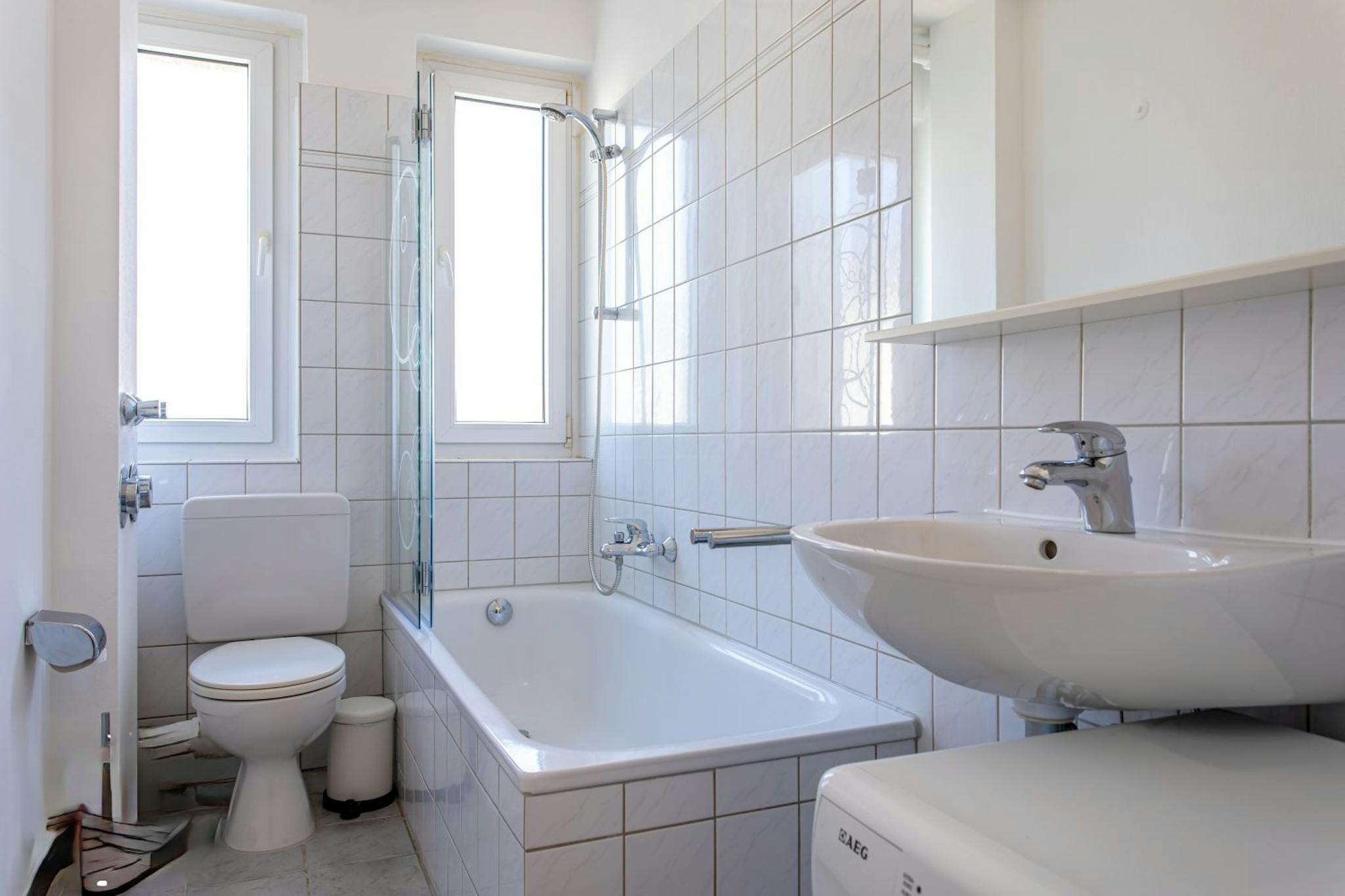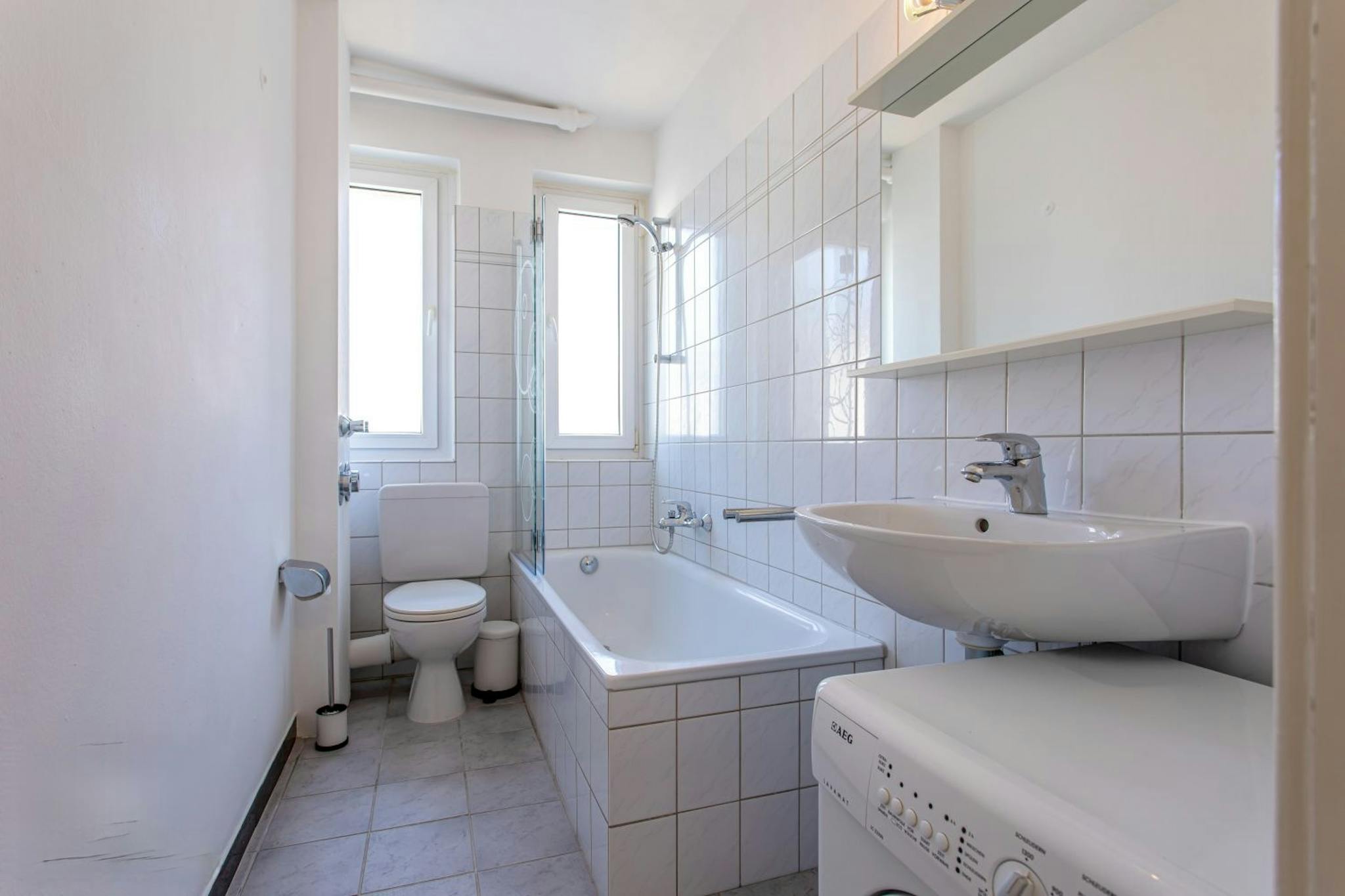 Das Tageslichtbad ist weiß gefließt. Eine Waschmaschine ist vorhanden.