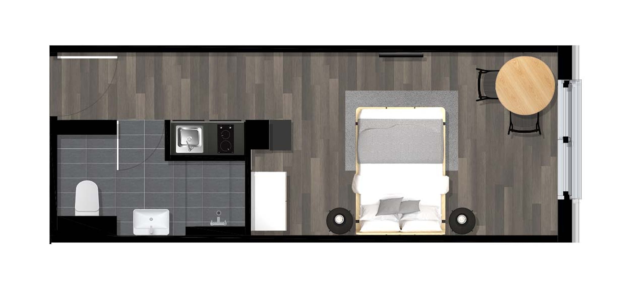 Our private apartments come fully furnished with everything you need for a comfortable daily life, such as a bed with a premium mattress with bedsheets, pillows, and duvets, a large wardrobe, table, and chair for work with a lamp. Each flat has a spacious bathroom, and a fully equipped modern kitchenette with everything from pans to a coffee machine, kettle and toaster.