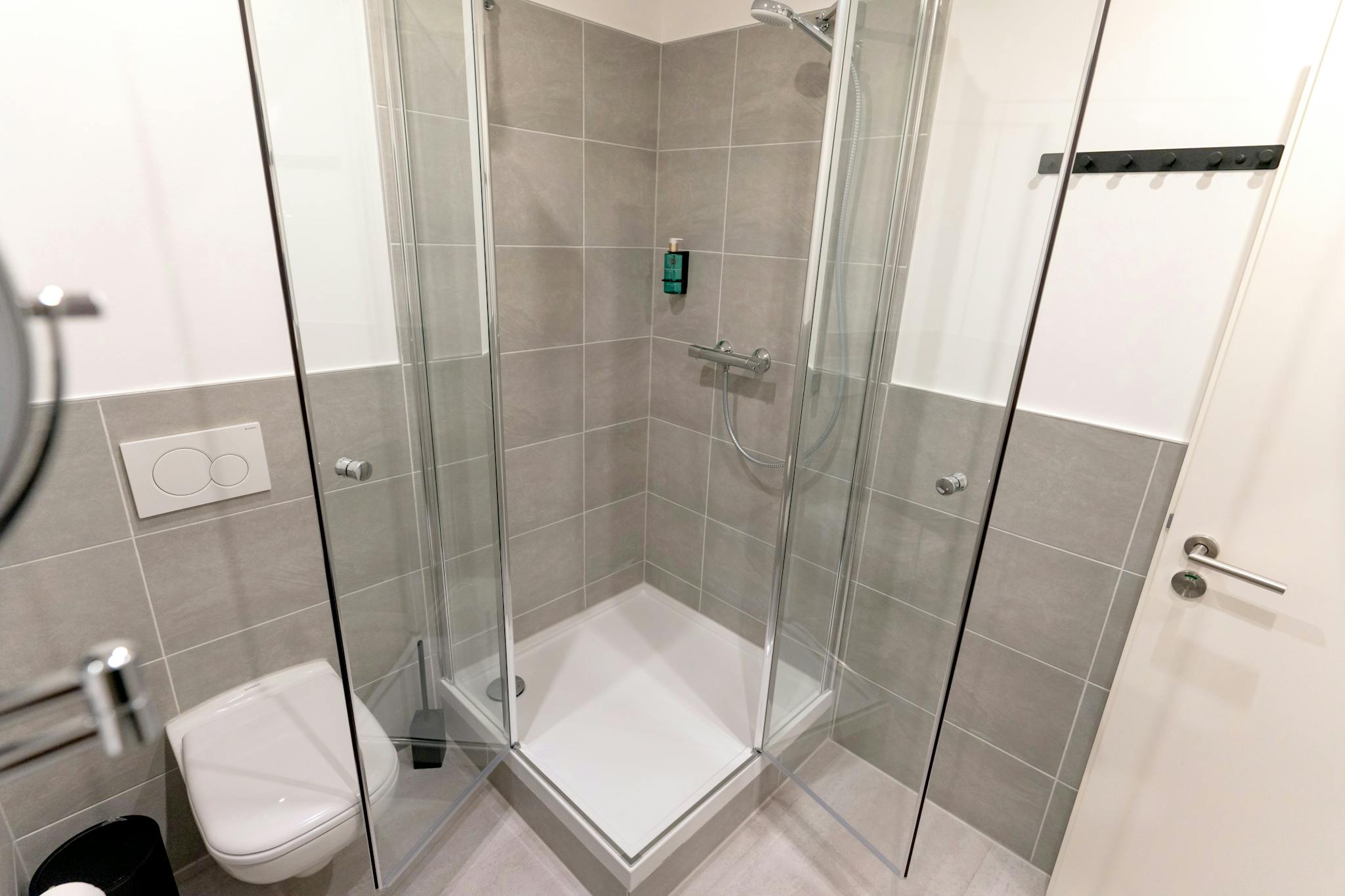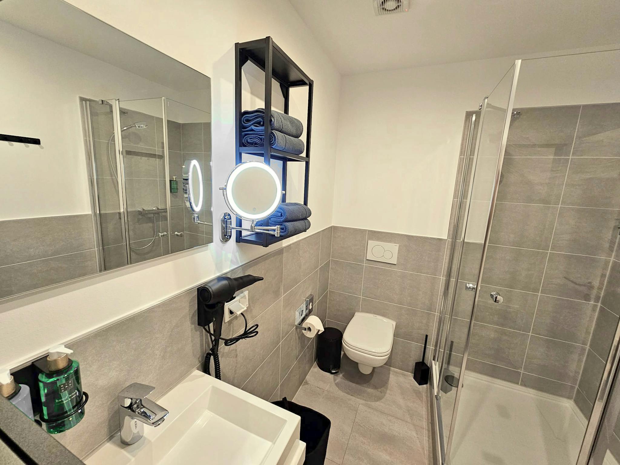 In den Gemeinschaftsbereichen stehen Ihnen drei moderne, voll ausgestattete Badezimmer zur Verfügung, jedes mit großzügigen Duschkabinen, Schminkspiegeln, Föns sowie frischen Hand- und Badetüchern für höchsten Komfort.