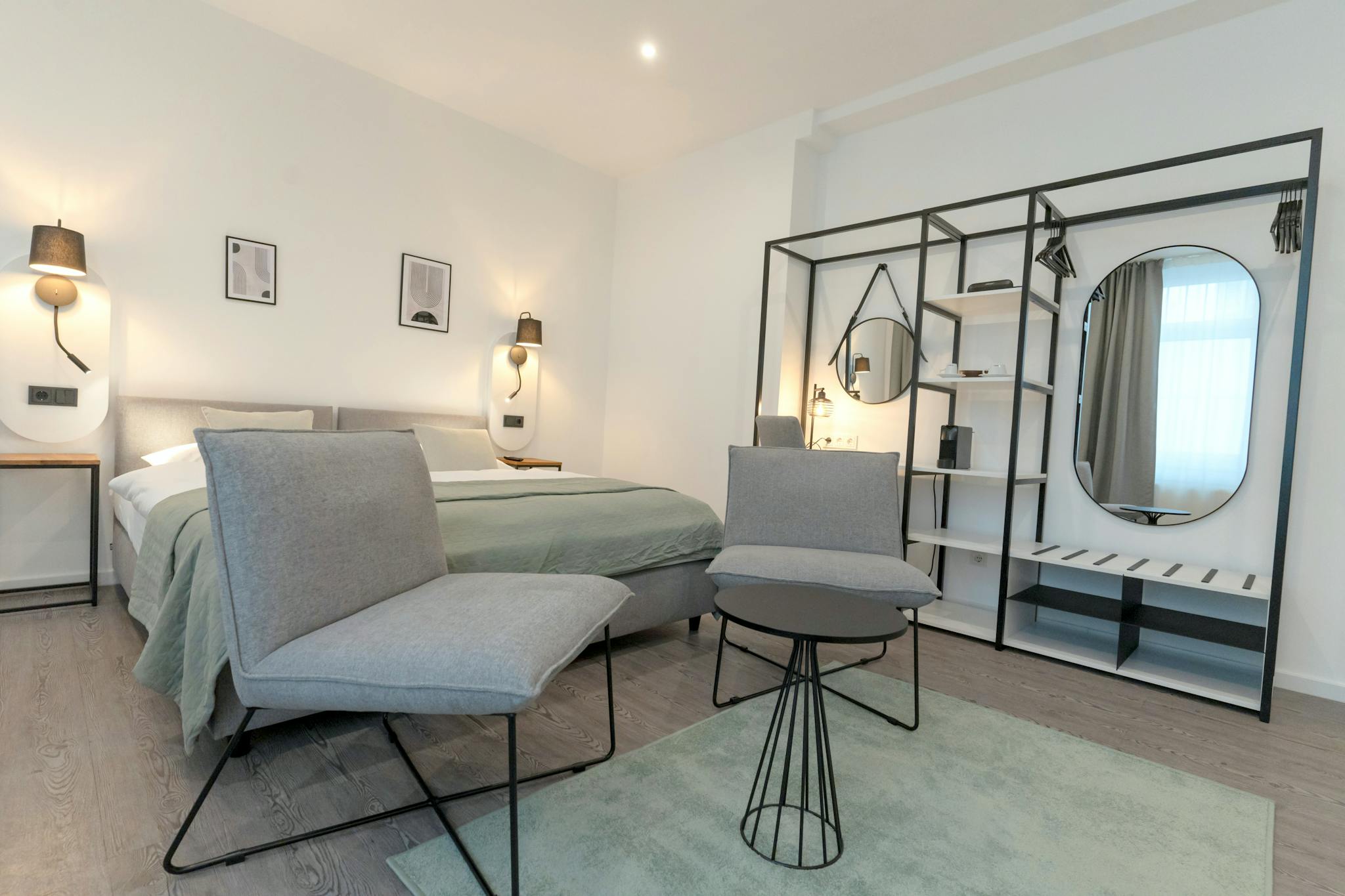 A swivel-mounted TV, a floor lamp and blackout curtains also guarantee flexible use and a relaxed atmosphere.