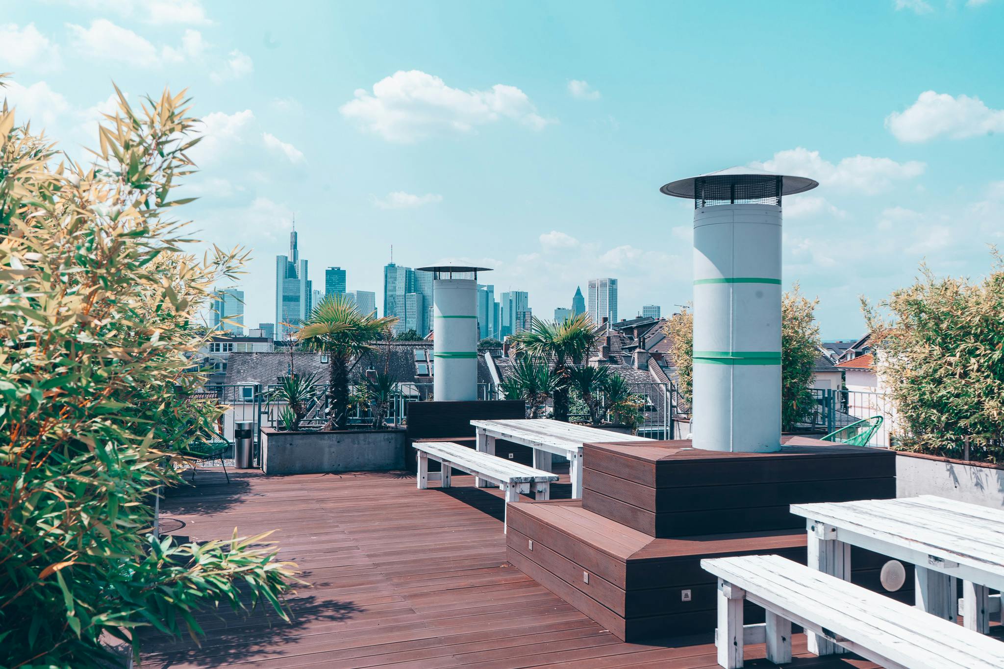 The view over the Frankfurt skyline is breathtaking. Mainhattan just! A wooden deck, two long boards with benches, bamboo, palm trees – a light breeze. Whether sunbathe, cozy get-together with friends. Or just end the day with a sundowner. Our 200 m2 terrace over the roofs of the city is simple: dreamlike! Open daily until 10pm.