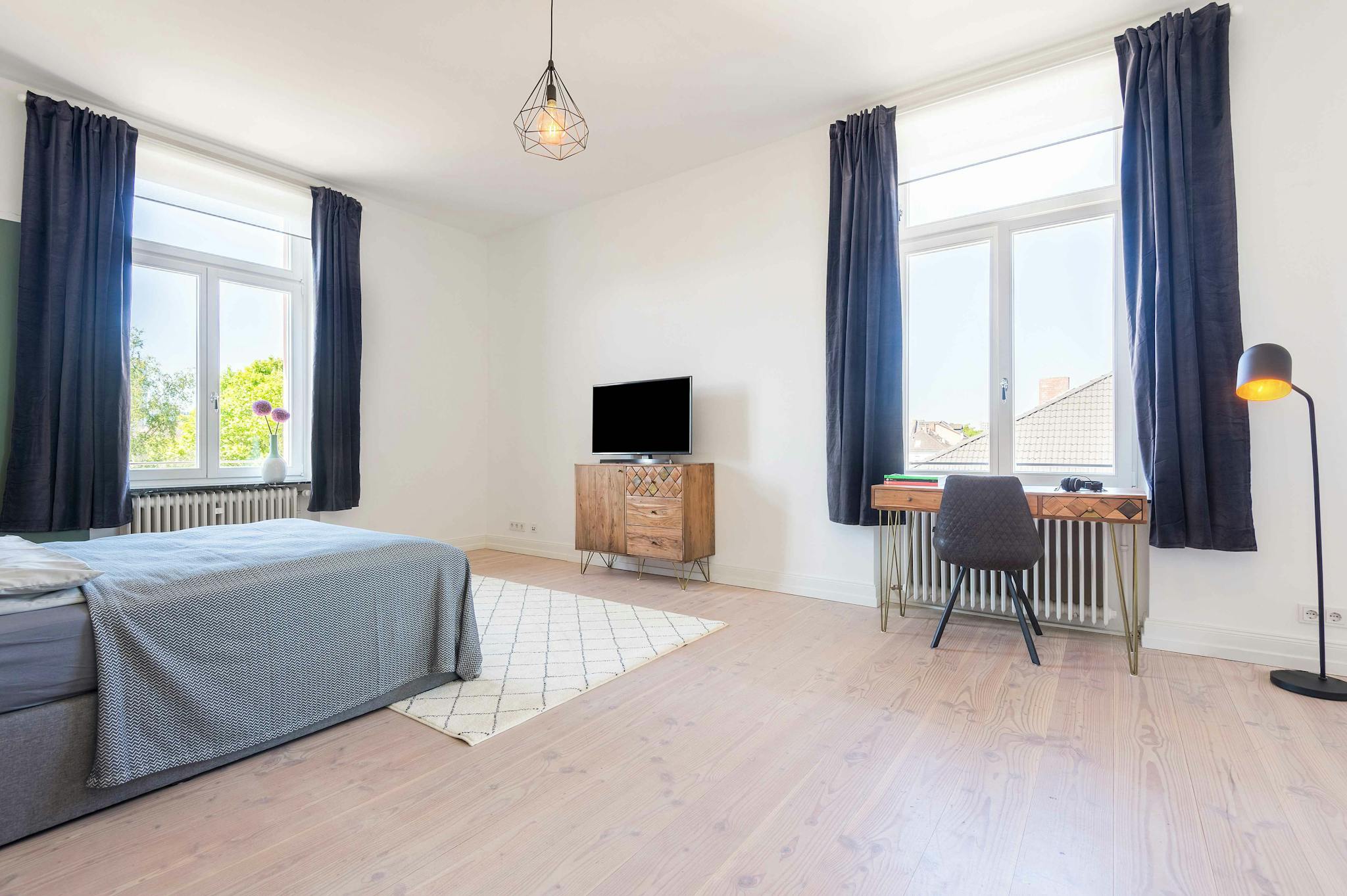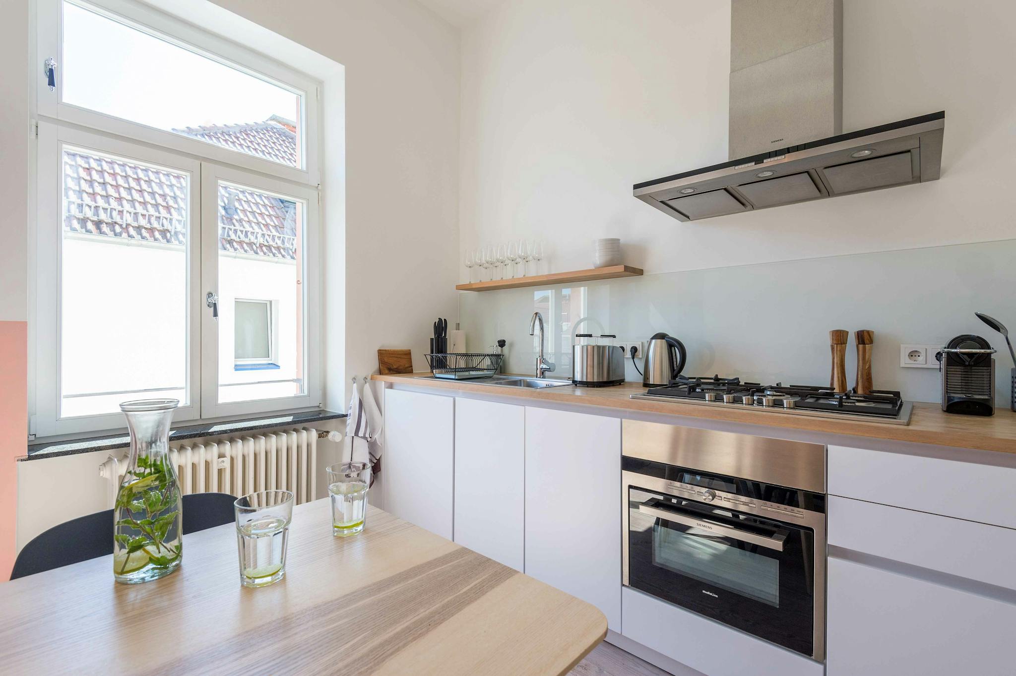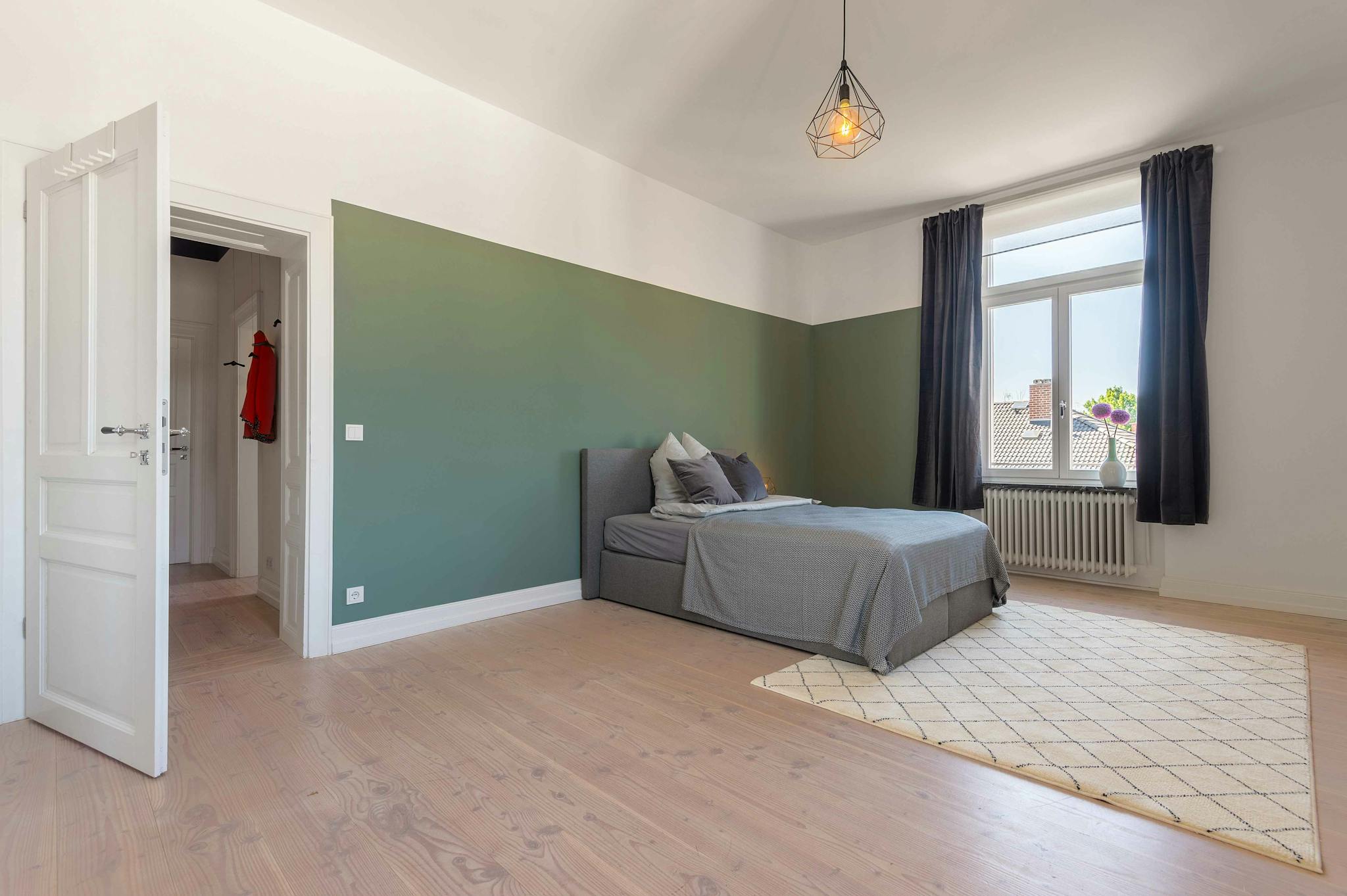 Live in a popular quarter of the city, with very good infrastructure, lined with shops, bars and restaurants. The inner city is close by and there is easy access to public transportation. This spacious apartment convinces with a huge hallway and generously designed rooms. Moreover, the kitchen has a dining area where you can enjoy common dinners.