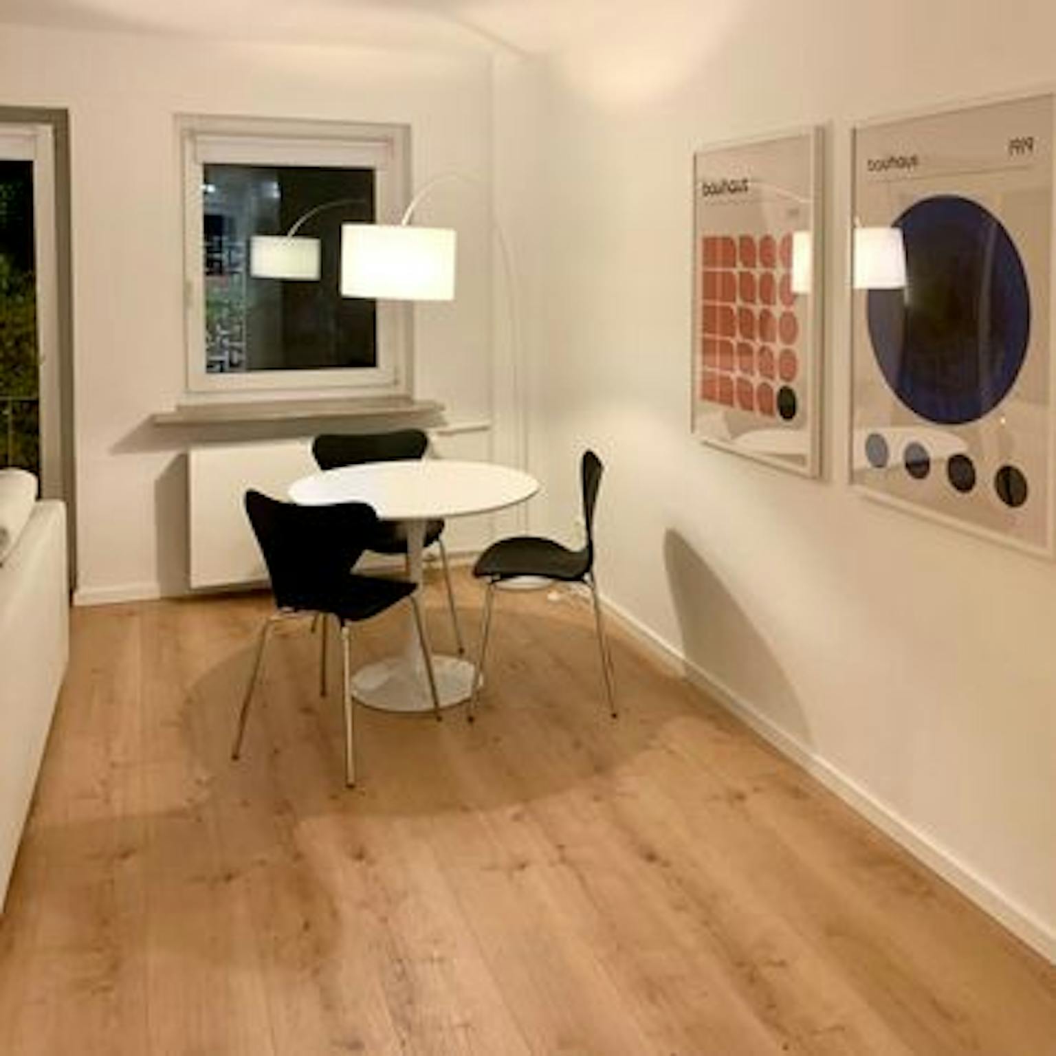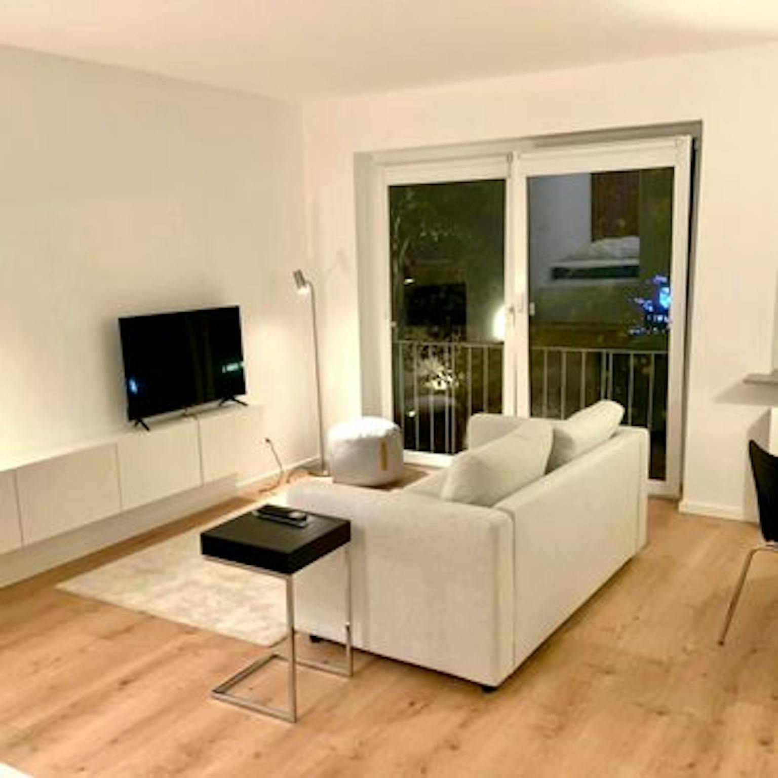 Der Wohn-Essbereich bietet bodentiefe Fenster mit Französischem Balkon, Sofa, Ess-/ Arbeitstisch, Pouf, Leselampe und Smart-TV.