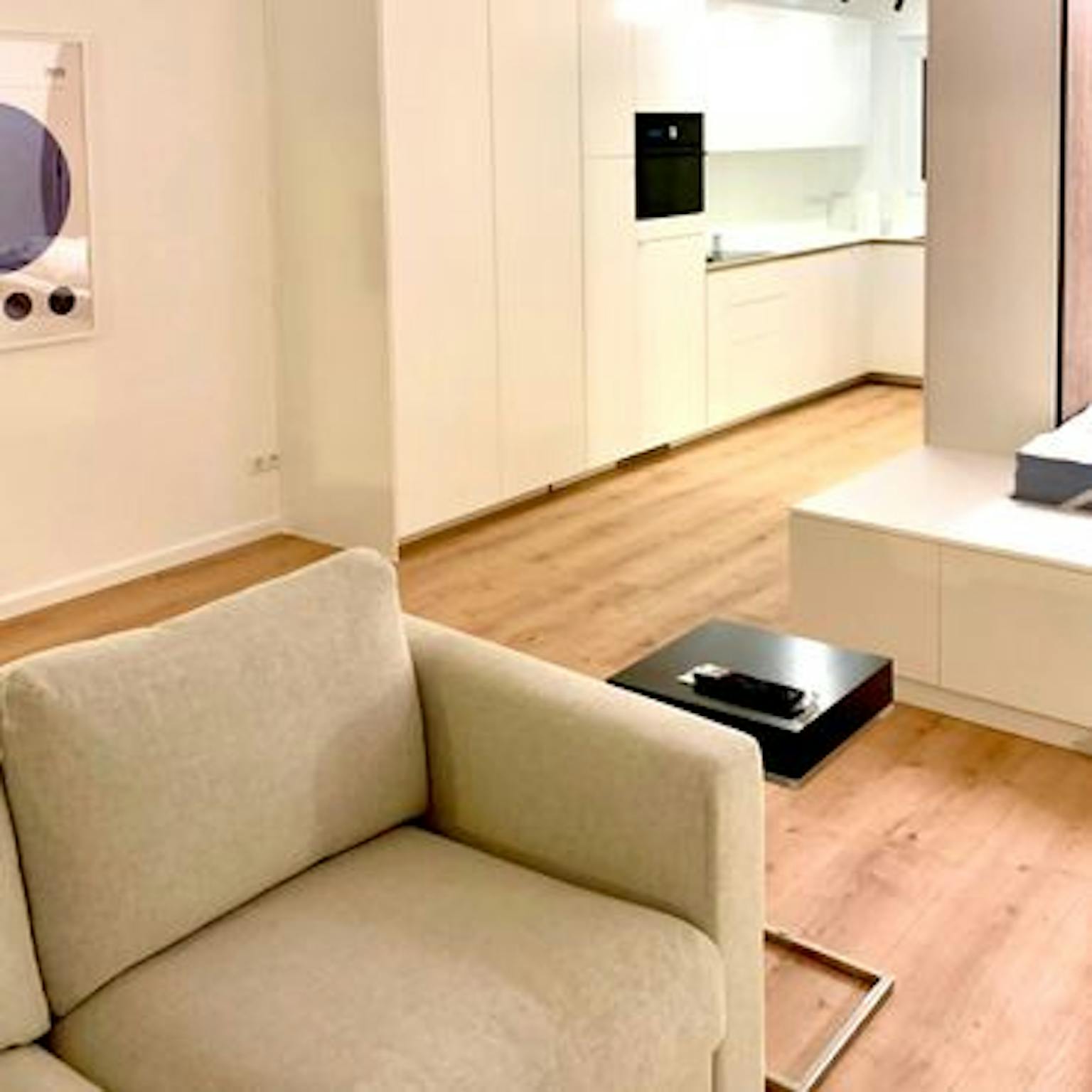 This thoughtfully designed apartment offers 42 sqm of space, light, and comfort. The customized furniture provides ample storage space while maintaining an open feel.