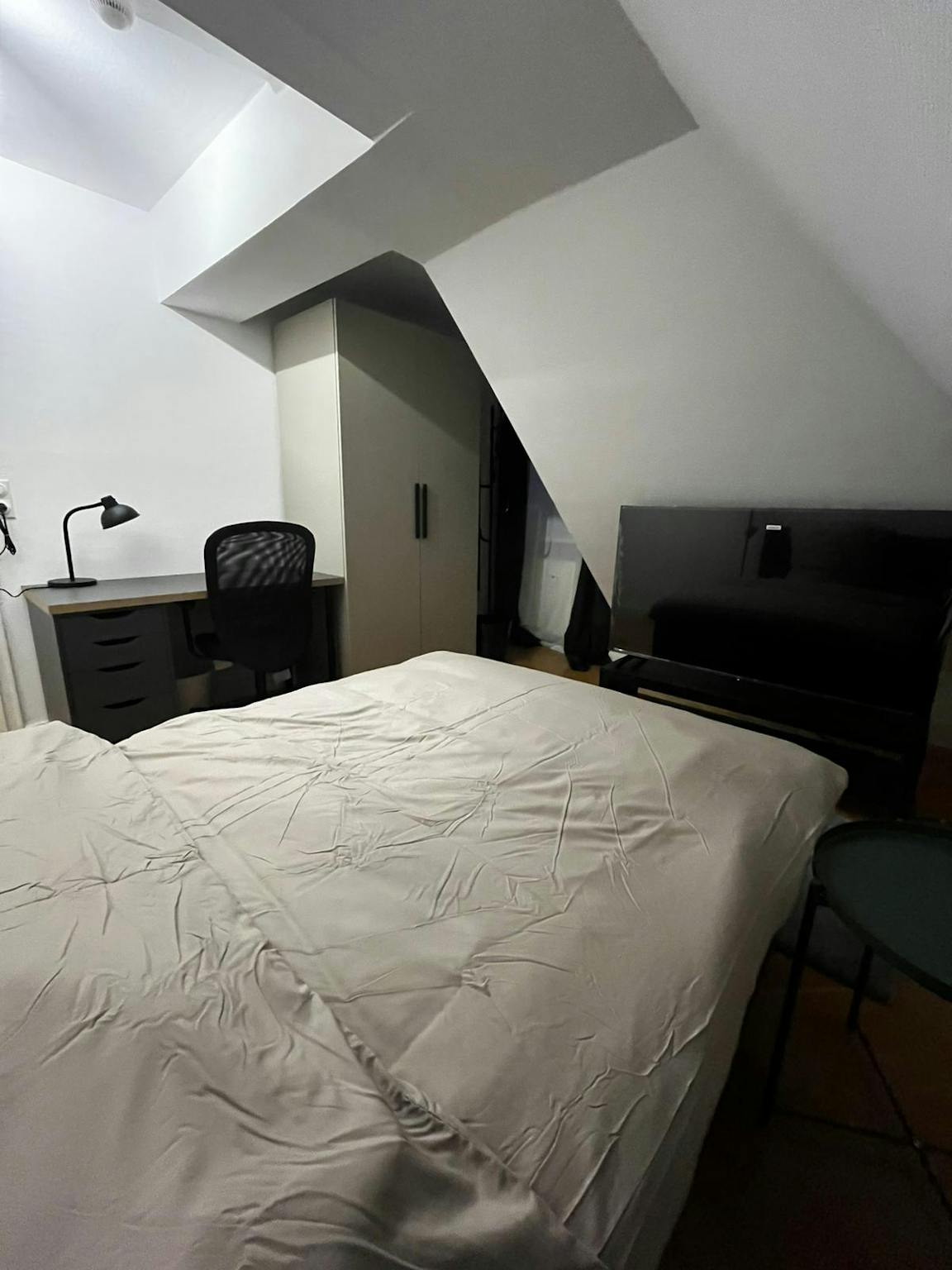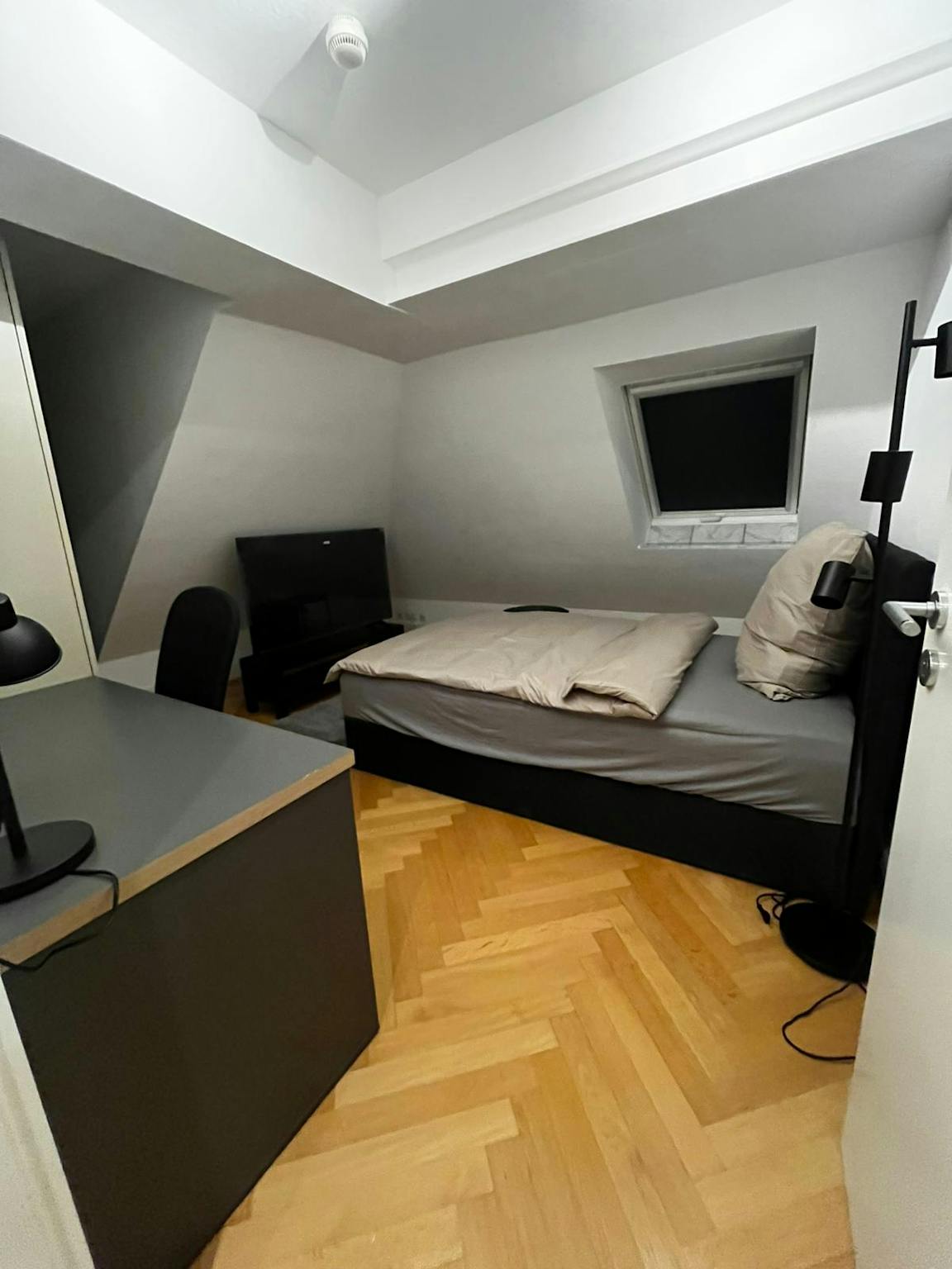 Außerdem findest Du einen Kleiderschrank für Deine Garderobe, einen Tisch und Stuhl für Arbeit oder Studium, ebenso wie einen SMART TV (55 Zoll) für Deine Unterhaltung.