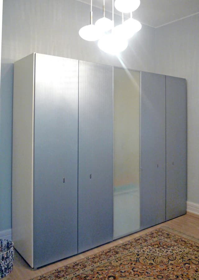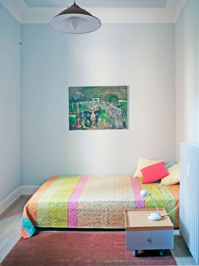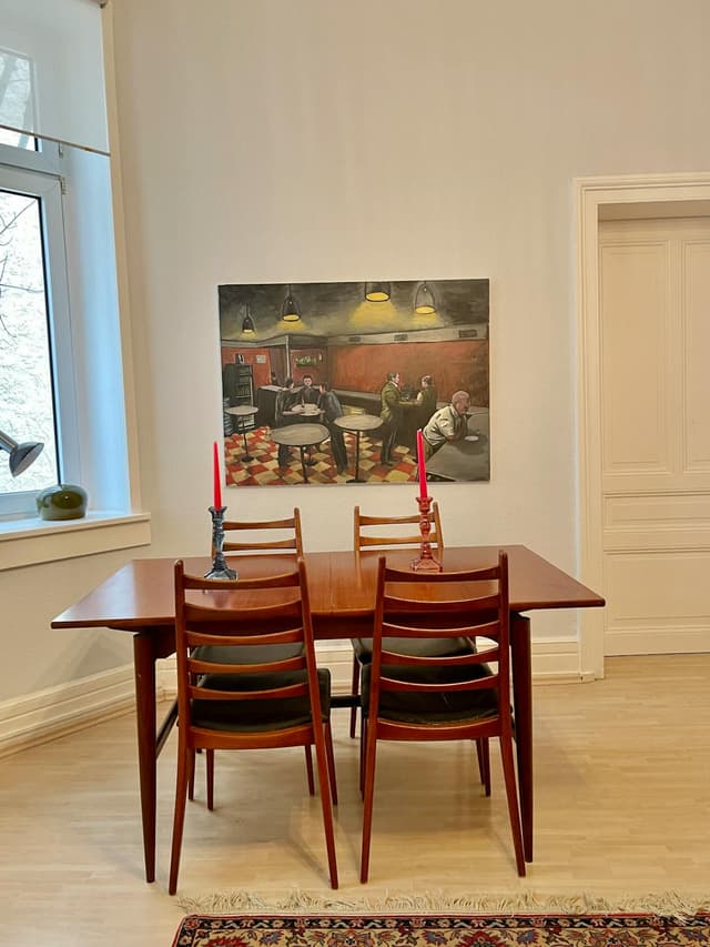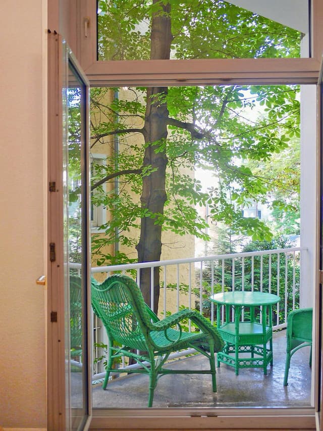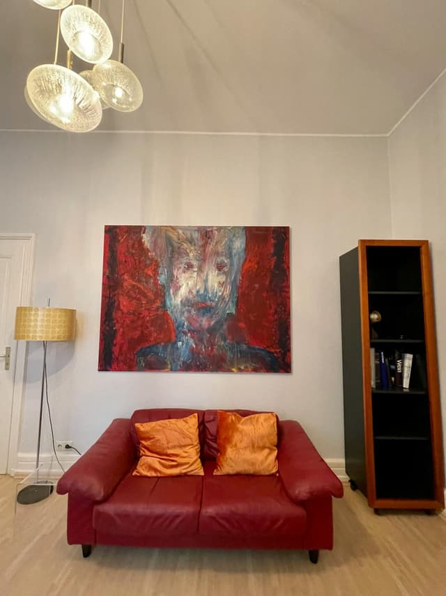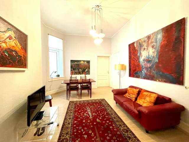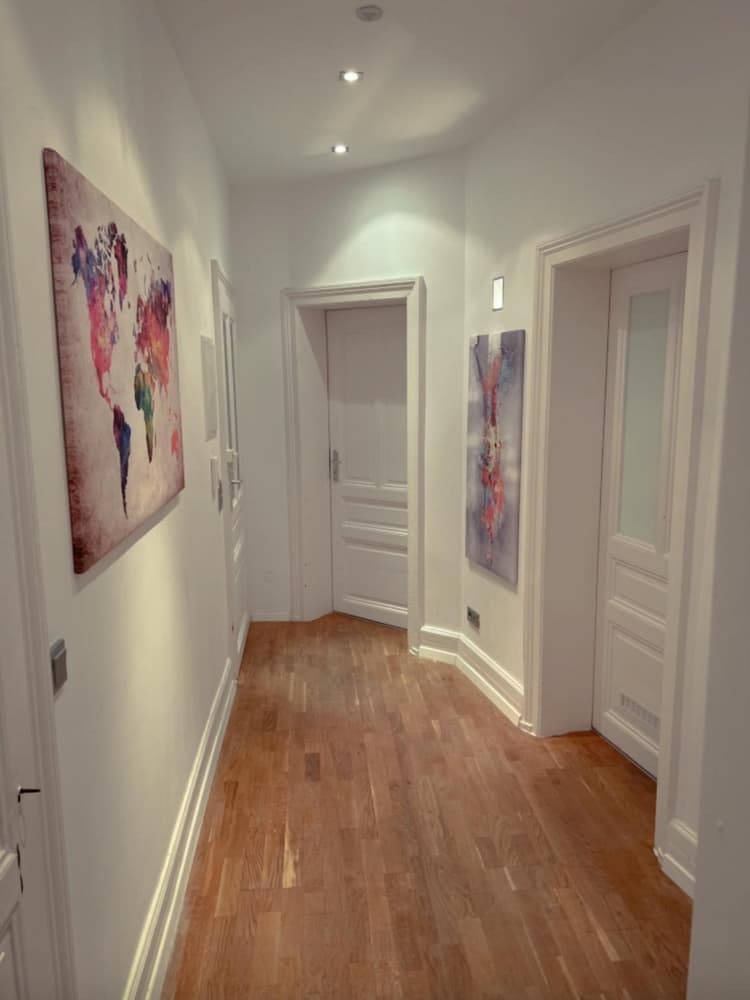 Big room 25qm with balcony + Single 16qm + living room room 20 in 76 qm residential flat. Tasteful Interior, designer furniture e.g. Ligne Roset, modern art. Big room equipped with double bed (hidden) m clothes wardrobe, all Ligne Roset, , Moormann desk with Vitra office chair, 3 Midcentury reading lamps and ceiling lustre, oriental carpet. Smaller guest bedroom with Ligne Roset Travel Studio bed 120x200cm and separately extendable guest bed at same height, can be used as a huge double bed or 2 separate beds; Colani little desk, chair, Philipp Starck ceiling lamp and midcentury reading lamp. Living room with small Knoll leather sofa English red, Mid-century Lübke dining table and 4 chairs, floor lamp and mid-century ceiling lustre. Legendary Bulthaup System 20 kitchen, Gaggenau kitchen appliances, incl. huge side-by-side fridge, Miele washing machine, fully equipped. Separate guest toilet. Daylight bathroom with big window, bath tub, shower, foldable glass shower door, Philipp Starck nd Dornbracht designs.