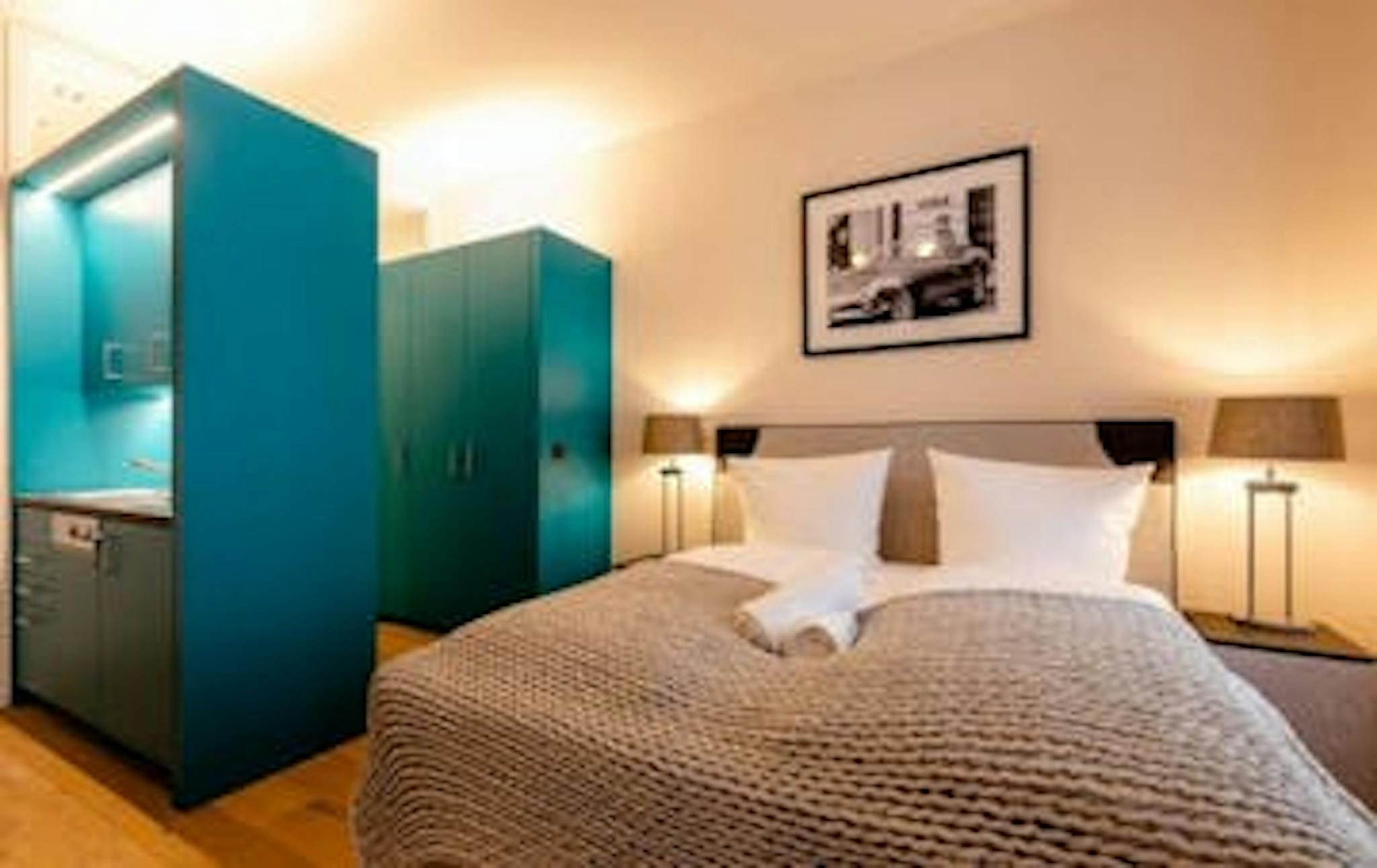 The listed old building from 1885 was completely renovated in 2017 and reveals a new shine without losing its old charm. Brand new technology and design meet the historical core of this beautiful old building. The rooms impress with their exclusive furnishings with designer furniture and heavenly discounts for box-spring beds. It became an oasis of well being for our personal worthy guests. In the only 9 exclusive apartments, extravagant color combinations and iconic black and white pictures dominate, the petrol blue kitchen which is one of the eye catchers of the apartment.