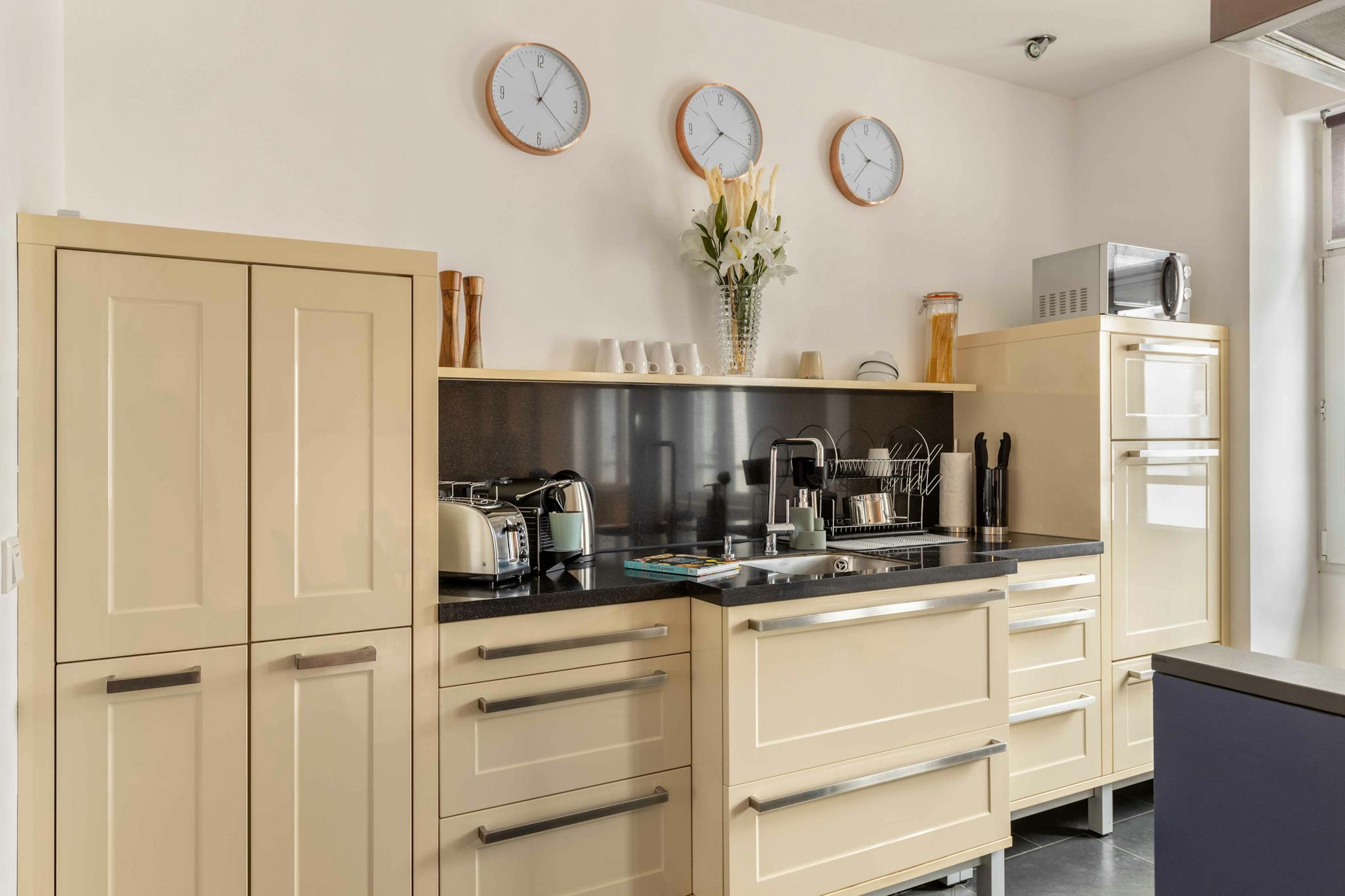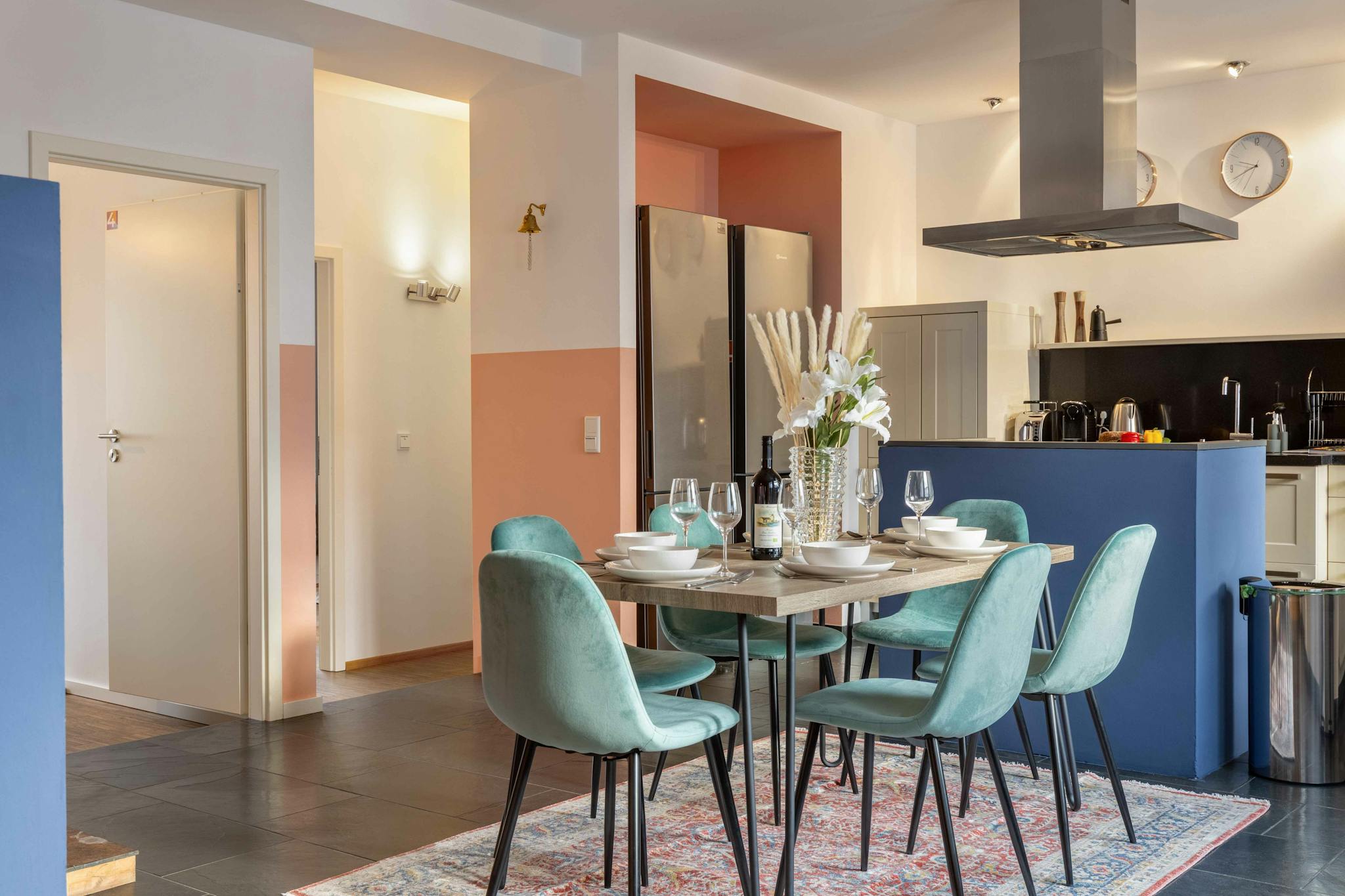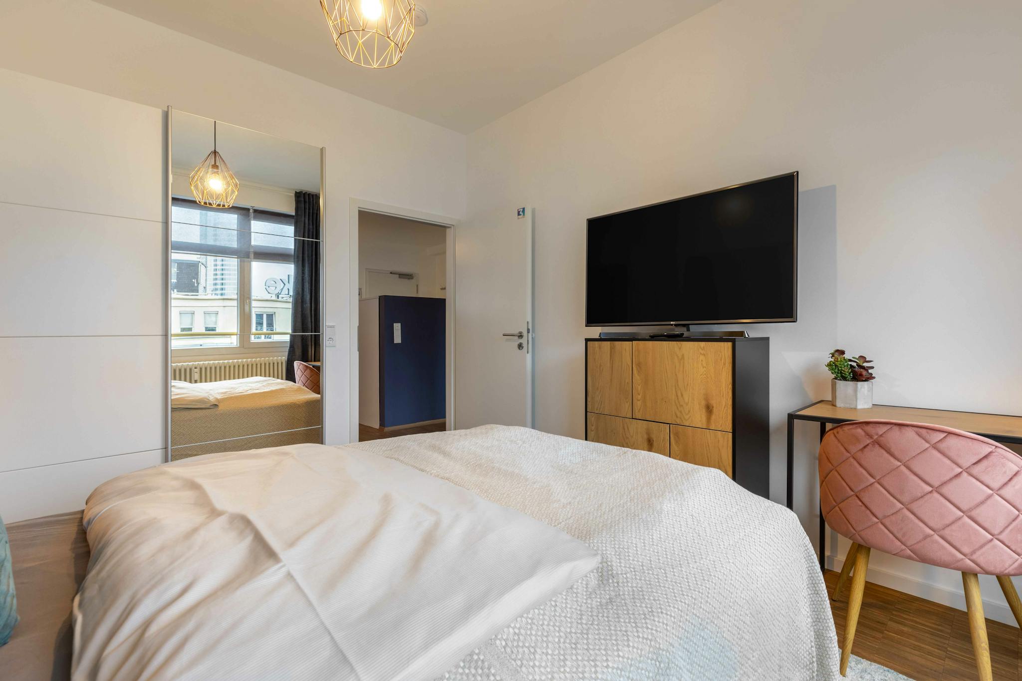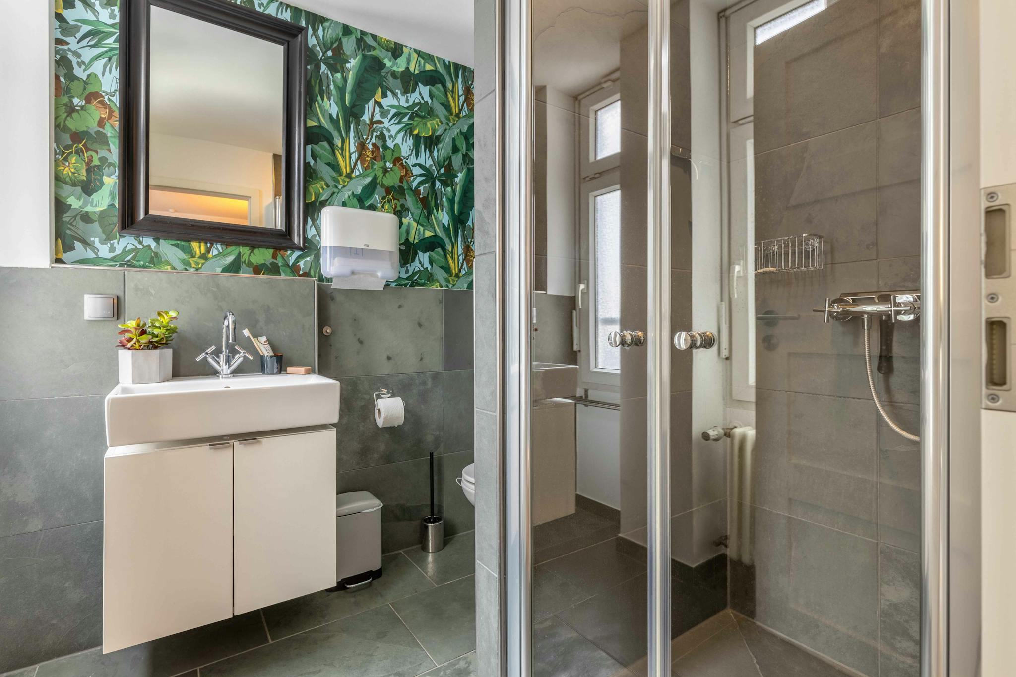 This location convinces with its centrality to all possible activities. Apart from the river Main and Frankfurt’s skyline, where you can take beautiful walks at the promenade, the central station is close by. The flat is bright and modern. Moreover, a prominent community space is a big advantage.
