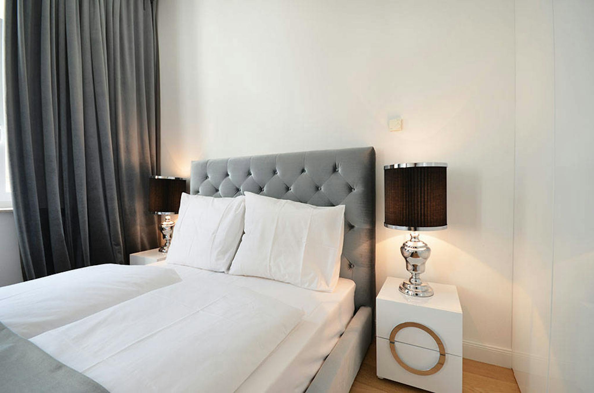 Make yourself at home in the spacious main room designed for lounging, relaxing, dining, working, cooking and entertaining. Composed to create a harmonic balance between contemporary comforts and soothing coziness, this environment has an elegant fully equipped open plan kitchen, superior furniture pieces - including a sturdy table with four cushioned chairs, a modernistic sofa set, light-controlling elongated floor-to-ceiling drapes, clean fresh finishes and smooth wood flooring.