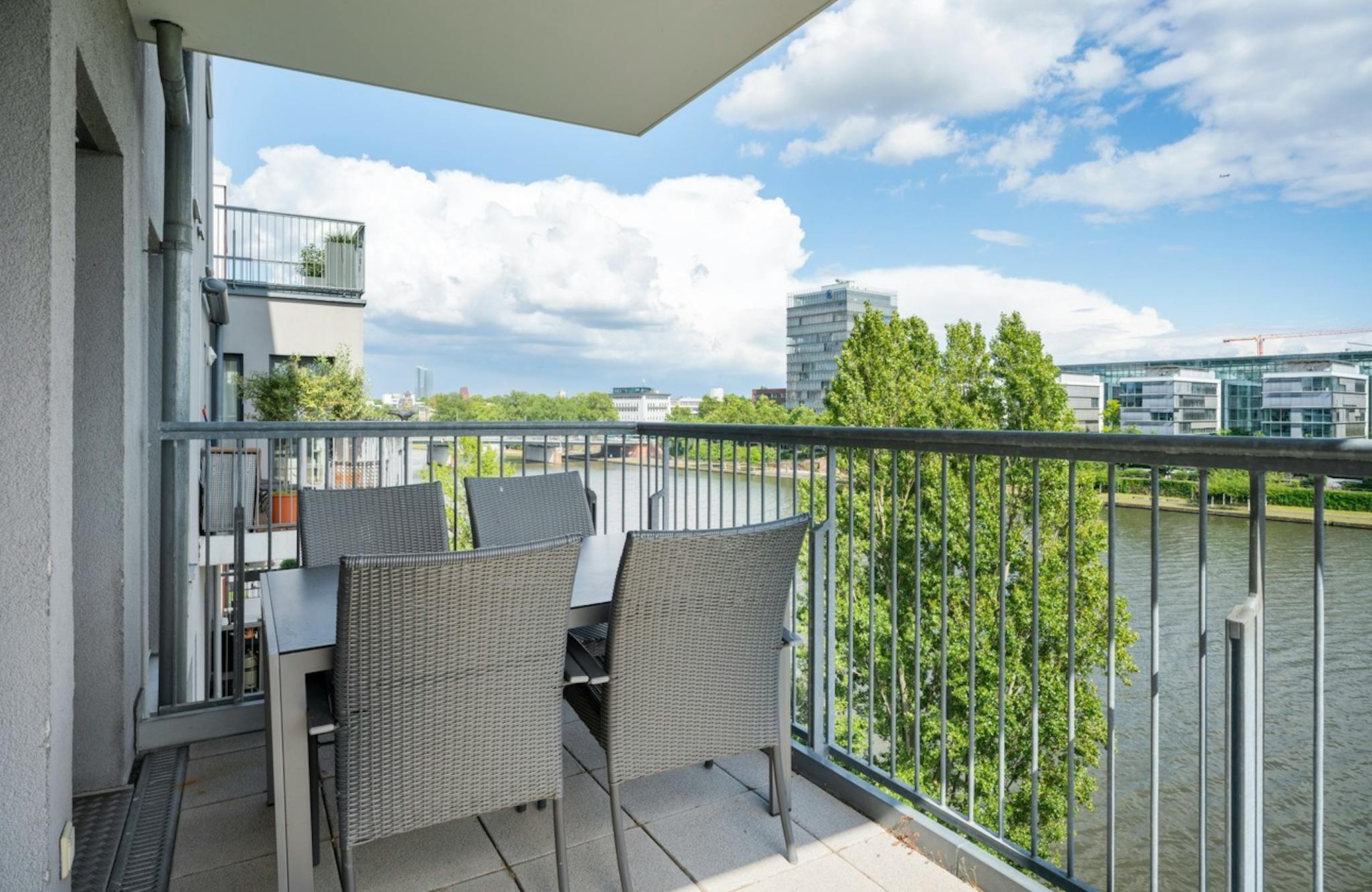 • Großer, hochwertig möblierter Balkon mit Blick auf den Fluss