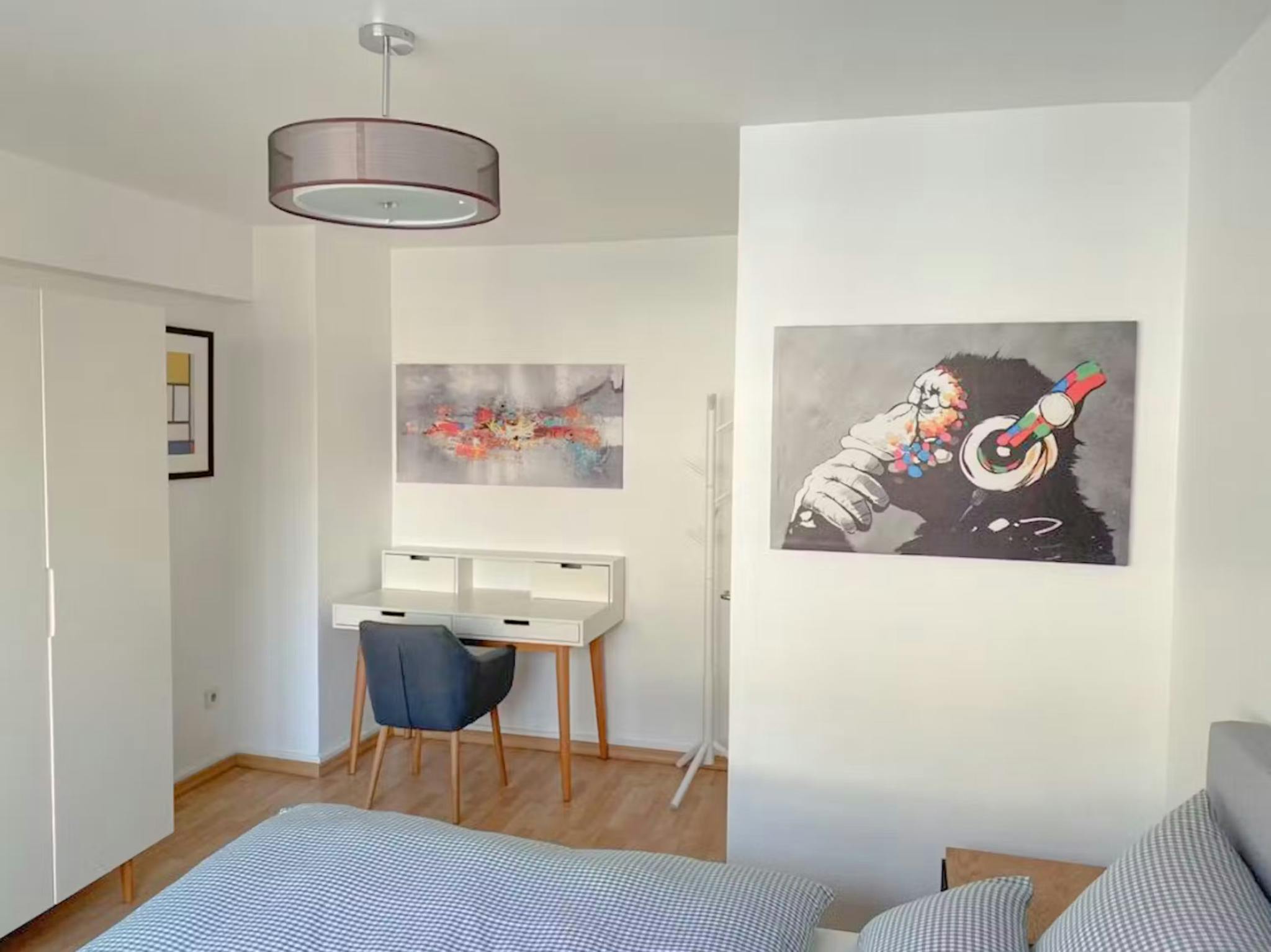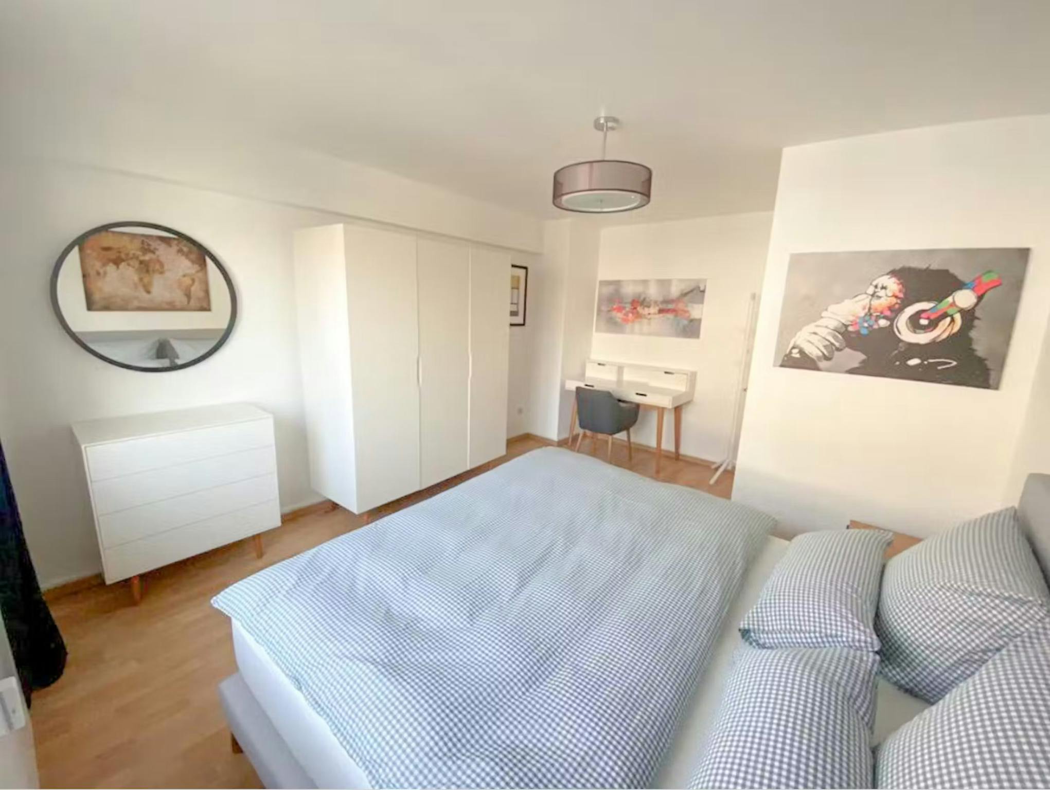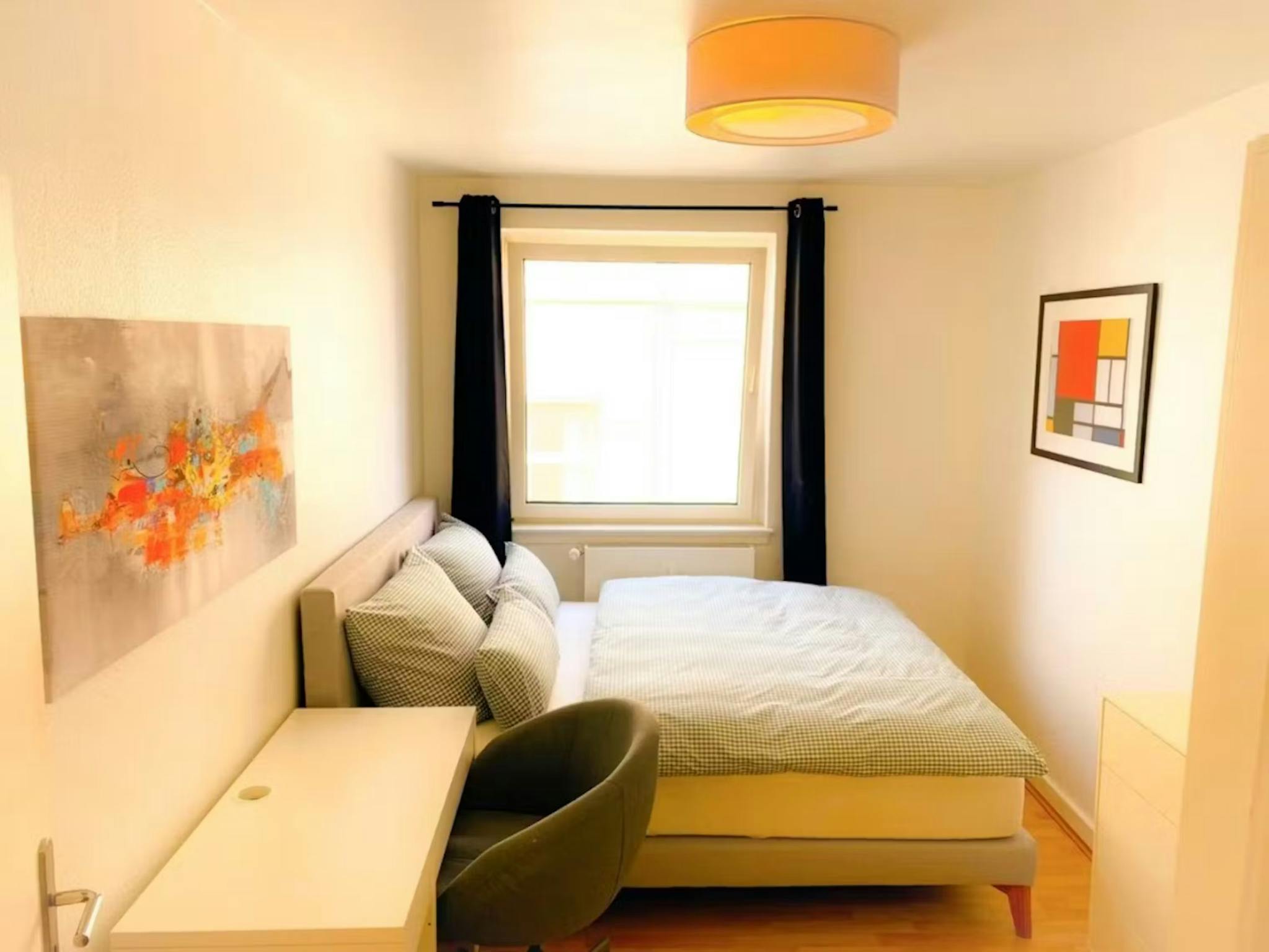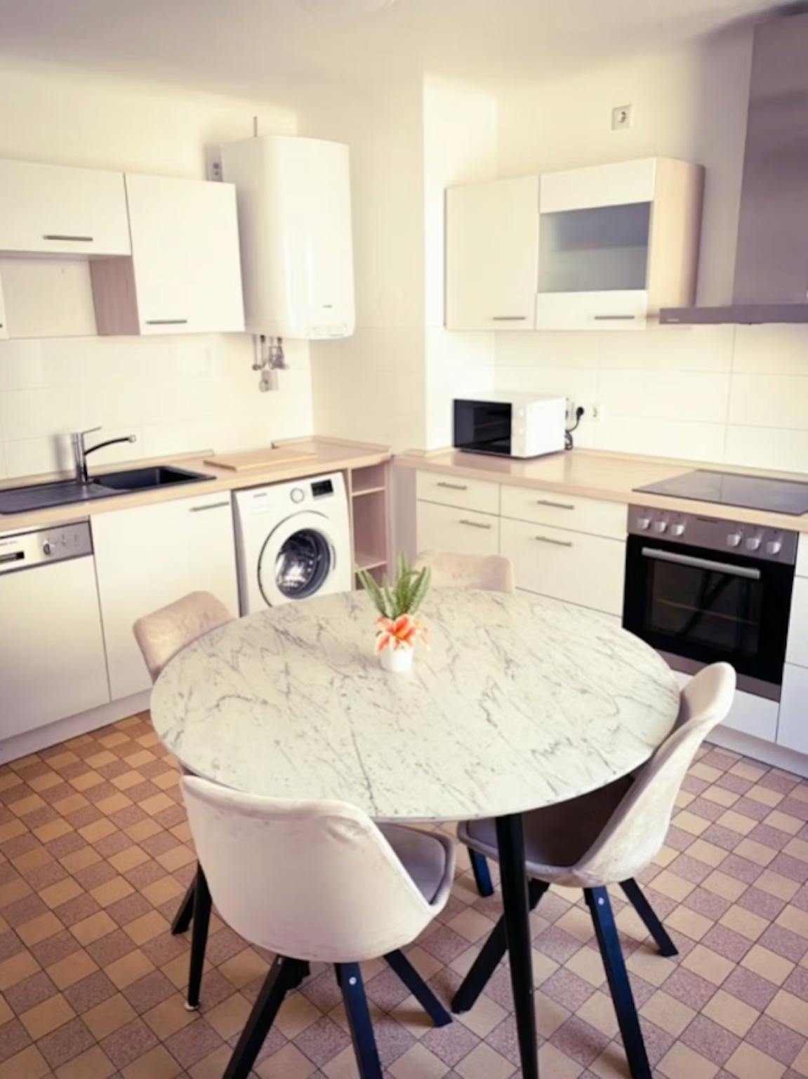 The apartment has 3 bedrooms. Each bedroom is equipped with a box-spring bed with fine bedding, two bedside tables, a chest of drawers, a large closet, a working desk with a corresponding working desk chair, and a large sofa with a sofa desk. In addition, there is a large elegant kitchen with all the necessary cooking equipment and utensils. The fridge in the kitchen is large and has enough space to keep the food fresh. There is also a freezer, an oven, a stove, a dishwasher, and a washing machine in the kitchen. Furthermore, a beautiful seating corner, consisting of a big marble table and four chic chairs, invites you to socialize with your co-tenants. The bathroom is very spacious and elegant with a high-quality rain shower. Moreover, the building is equipped with a modern elevator.
