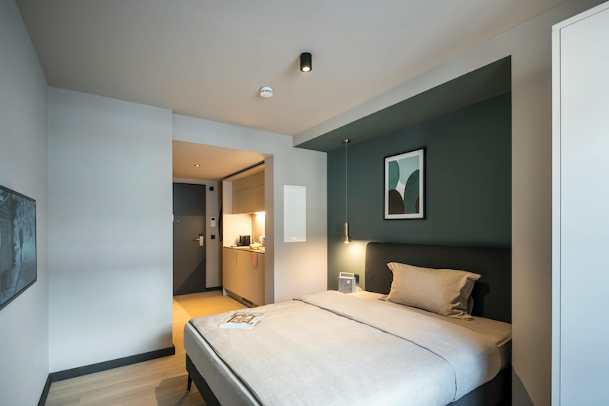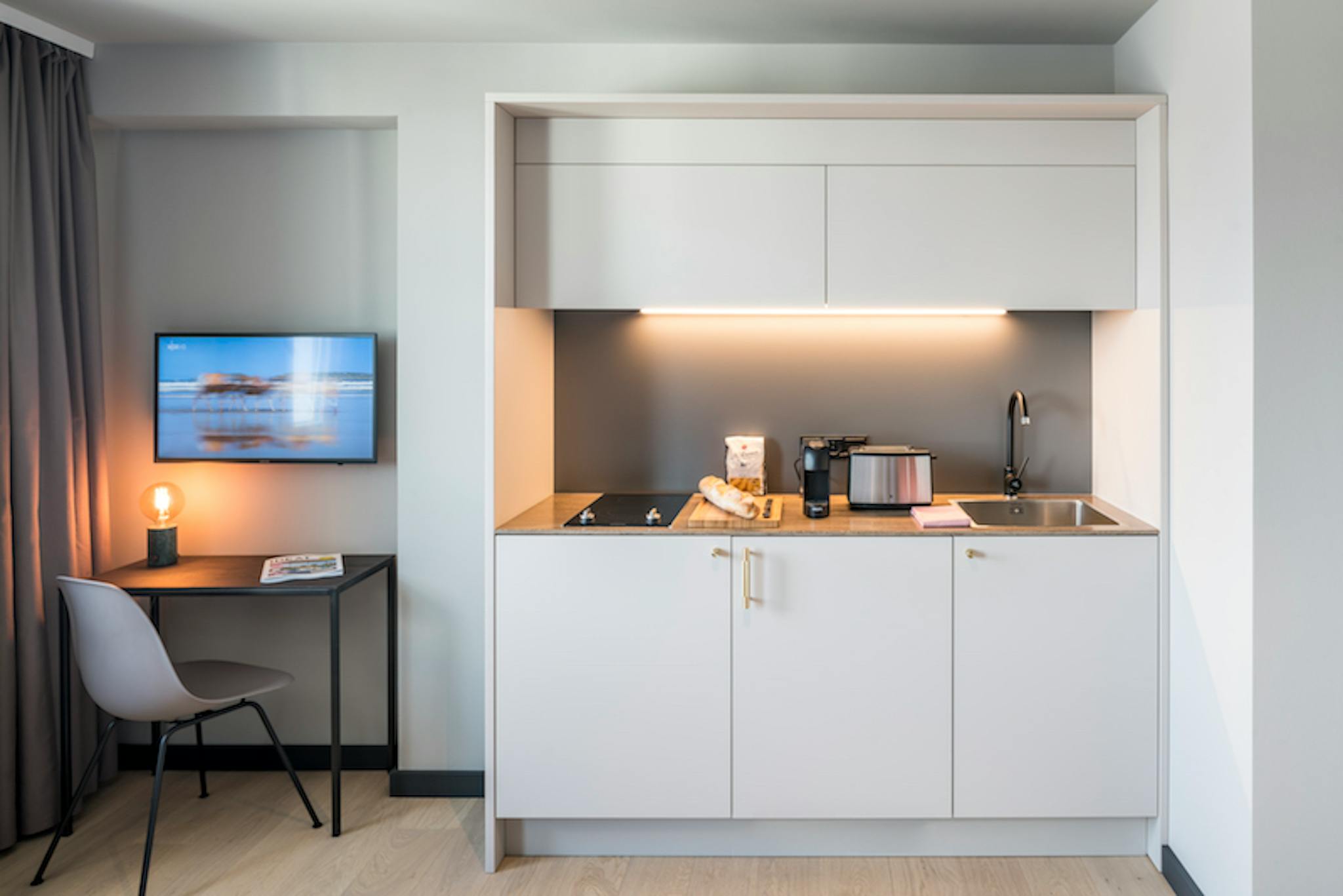 This cozy and modern apartment offers everything you need for a comfortable stay. Featuring a fully equipped designer kitchen with a refrigerator, ceramic cooktop, microwave, and dishwasher, it’s perfect for preparing meals with ease. The space includes a small workstation with a comfortable armchair, a sleek and modern bathroom, and elegant oak flooring. The 1.40m wide bed ensures a restful sleep and can accommodate two people comfortably. Enjoy the convenience of extensive apartment amenities designed for a stress-free living experience.