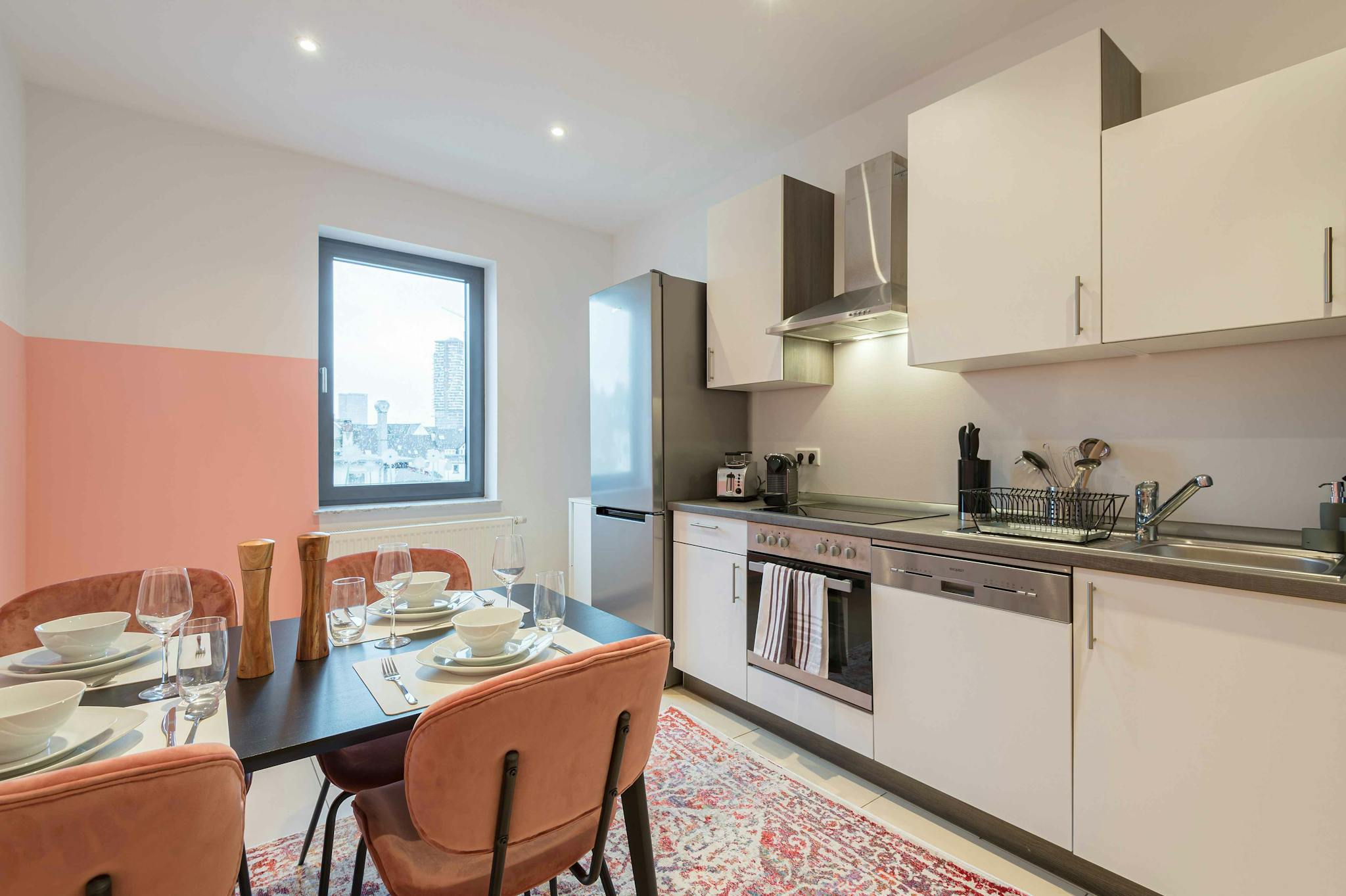Live in one of the most popular districts of Frankfurt, Bockenheim. There are numerous shops, bars and restaurants and the easy access to public transportation shortens the way to the inner city enormously. Our modern apartment in a stylish old building awaits your move.