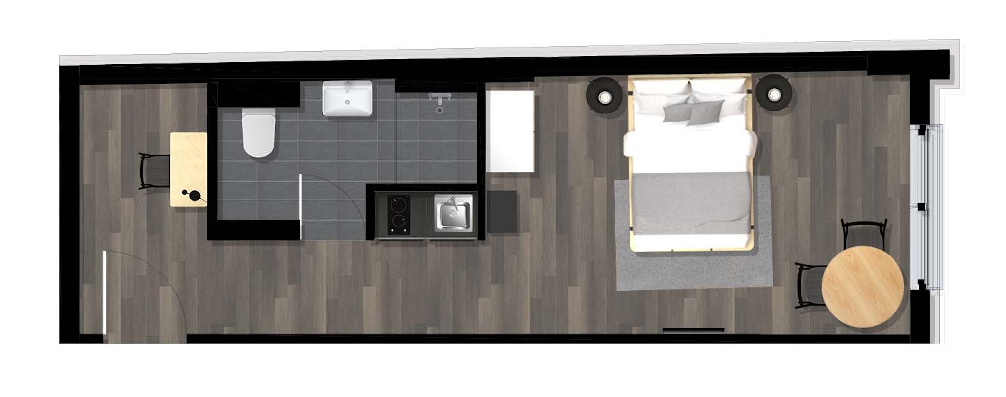 Our private apartments come fully furnished with everything you need for a comfortable daily life, such as a bed with a premium mattress with bedsheets, pillows, and duvets, a large wardrobe, table, and chair for work with a lamp. Each flat has a spacious bathroom, and a fully equipped modern kitchenette with everything from pans to a coffee machine, kettle and toaster.