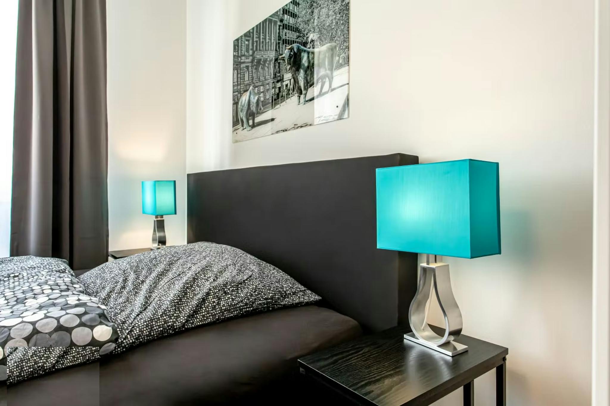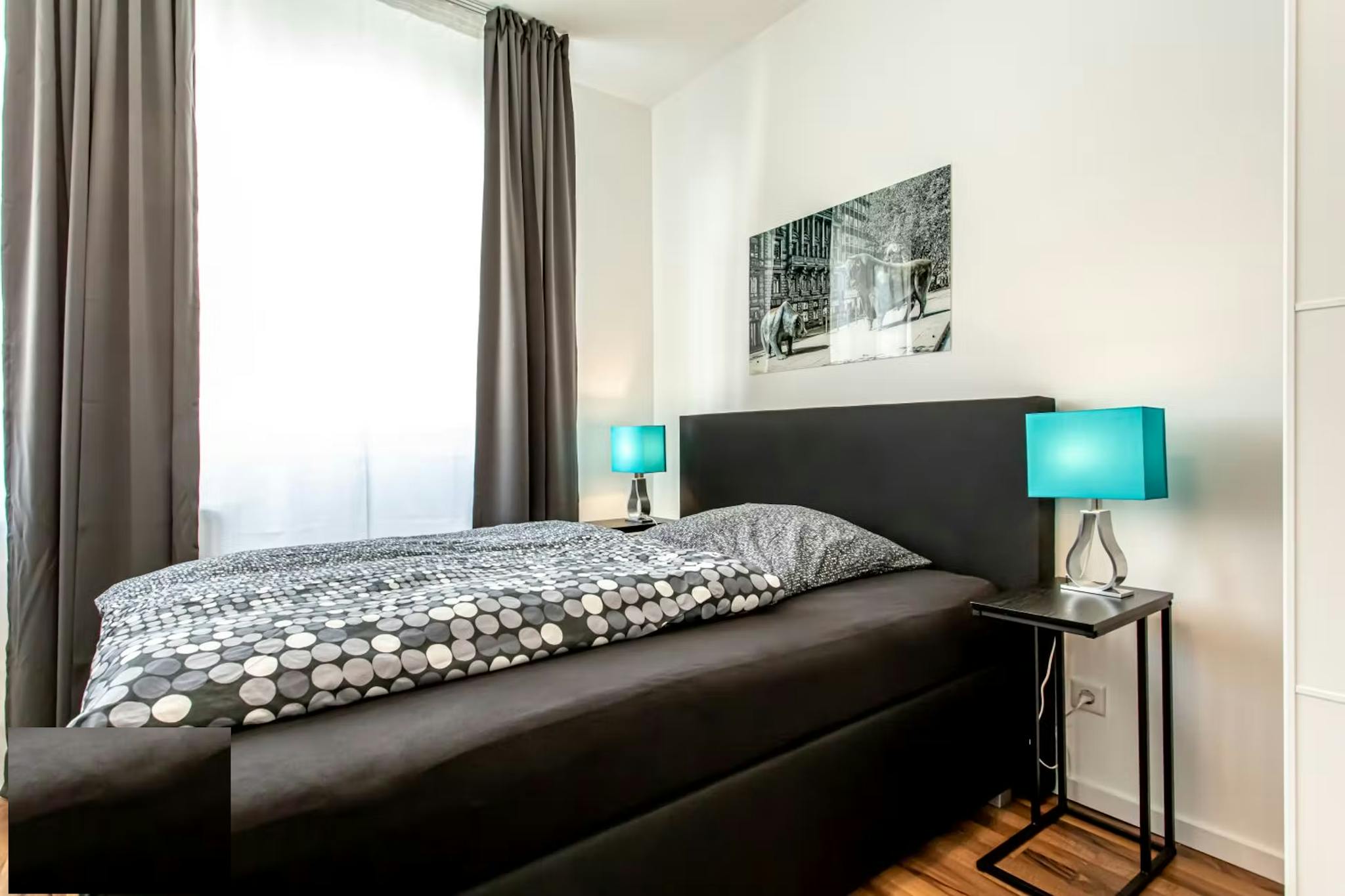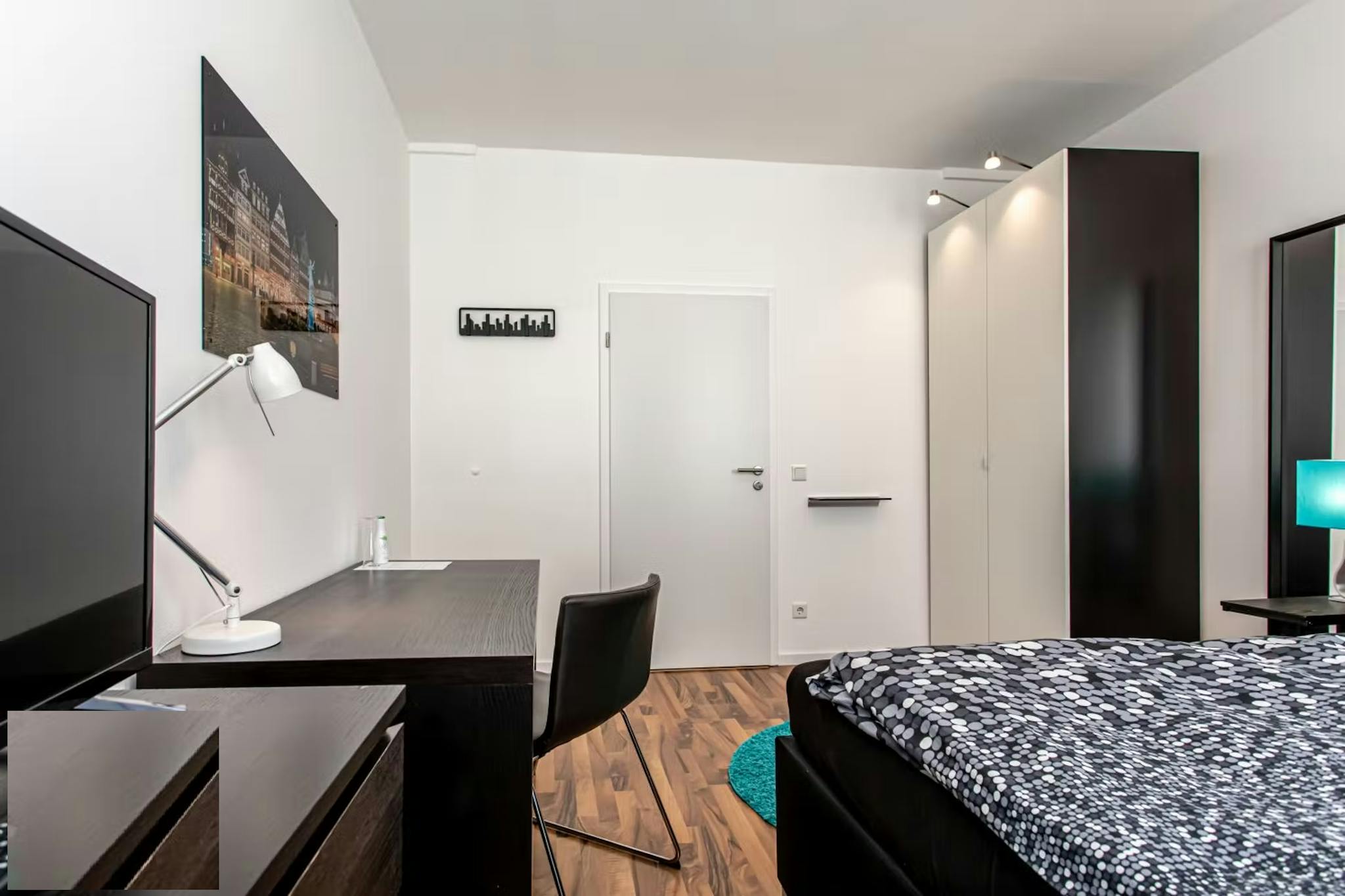 The rooms are equipped with a comfortable box spring bed including bedding and linen, spacious wardrobe, flat screen TV, side tables, desk and desk chair. In addition, the shared flat has a central free WLAN access for all residents.