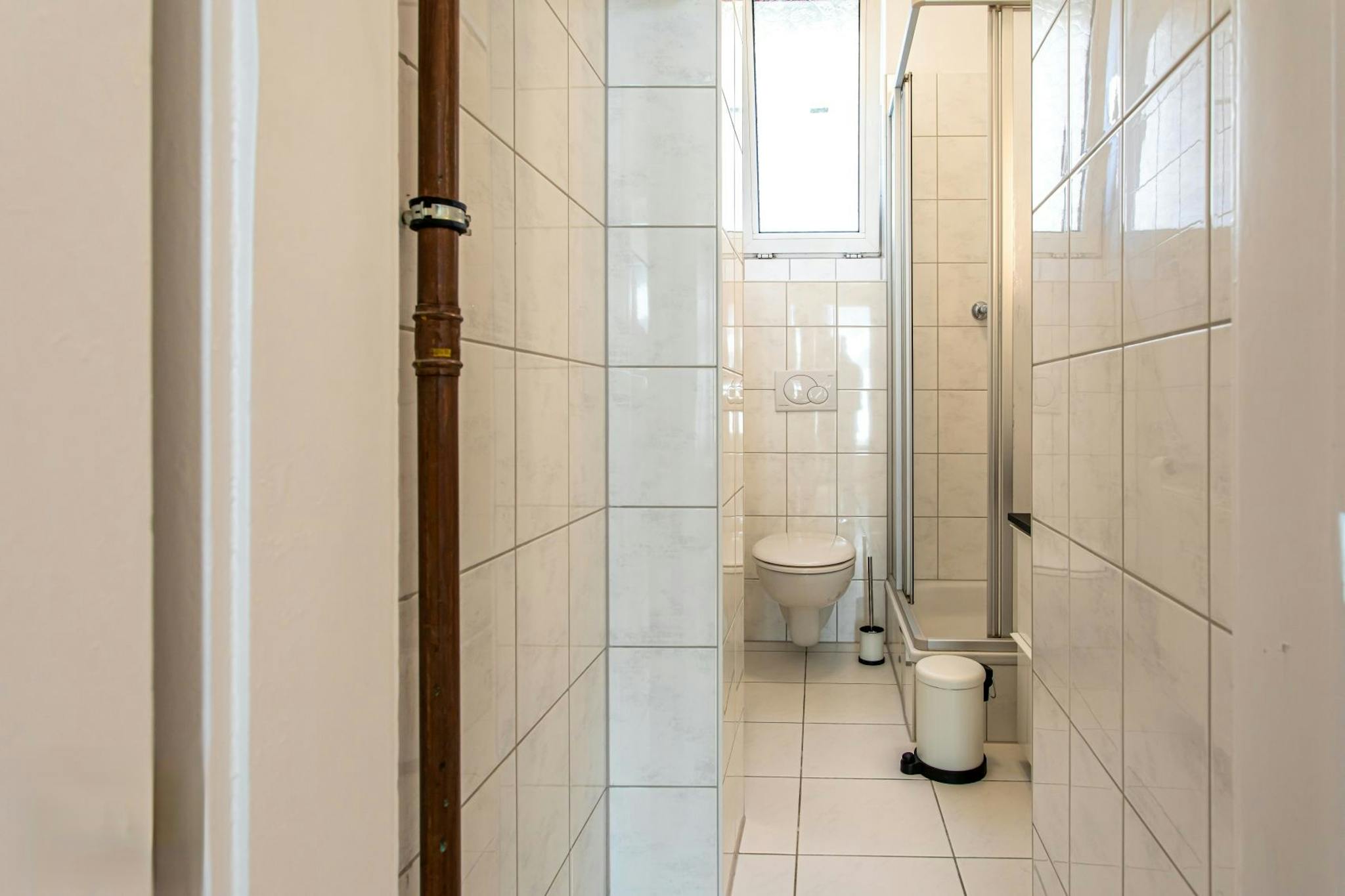 Das Badezimmer verfügt über WC und Dusche.