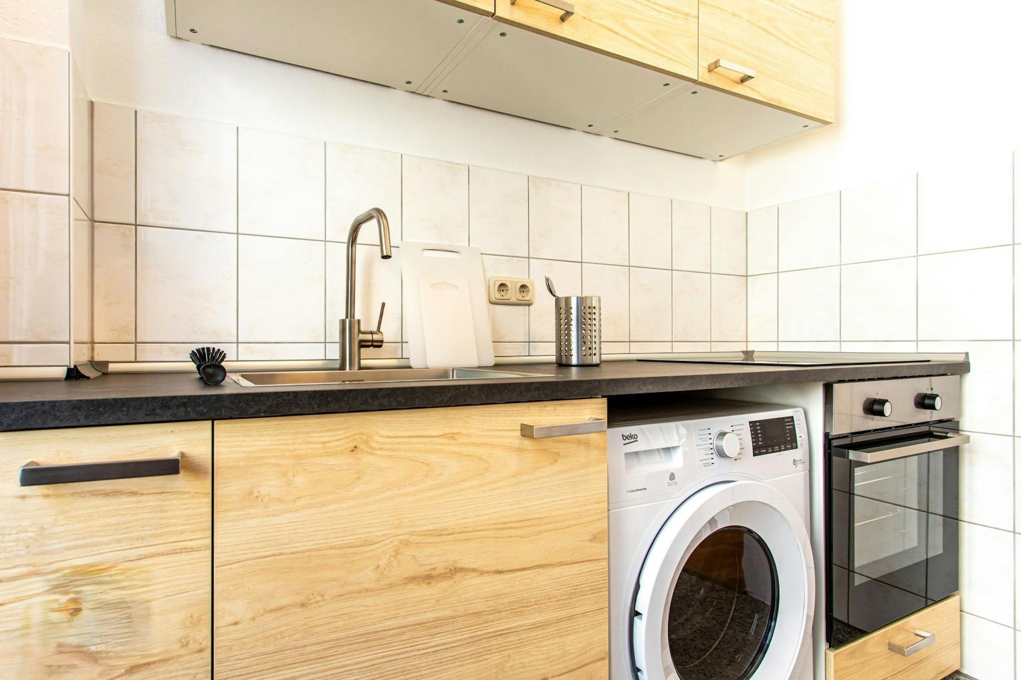Die Küche verfügt über eine Küchenzeile mit Kochfeld und Backofen, einer Kühl-/Gefrierkombi und eine Waschmachine. Die Küche ist komplett mit Geschirr und Kochutensilien ausgestattet.