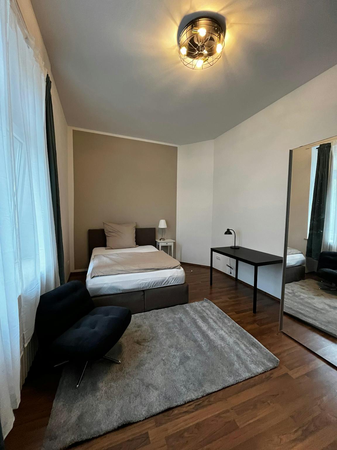 Ein großzügiges und praktisch eingerichtetes WG-Zimmer schafft eine „Wohlfühl“-Atmosphäre, sobald Du das Zimmer betrittst. Für einen erholsamen Schlaf steht Dir ein Boxspringbett mit den Maßen ca. 1,40m x 2,00m zur Verfügung.