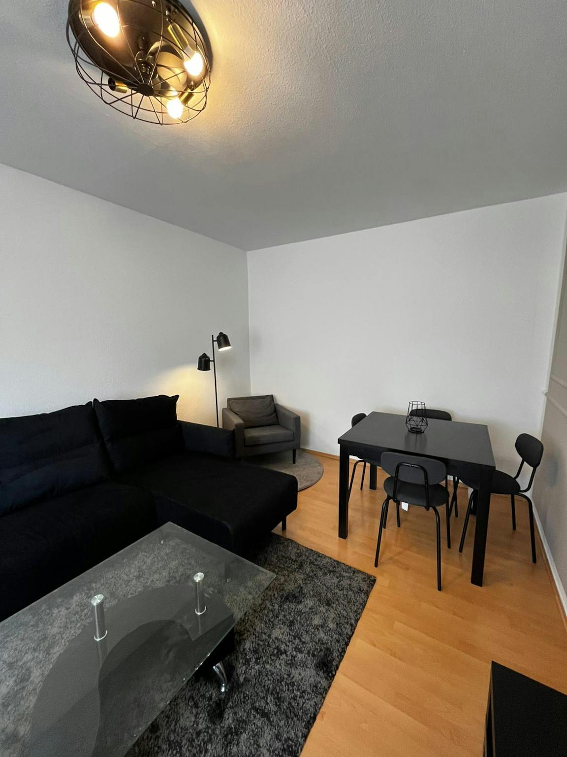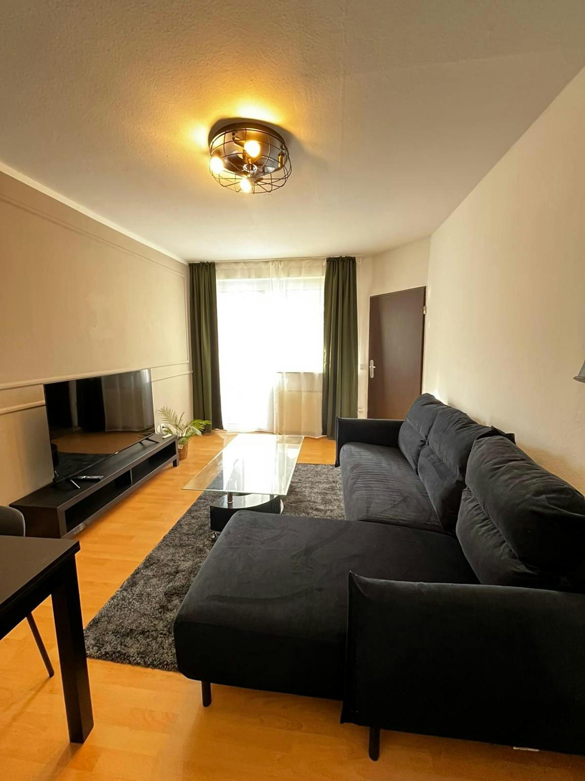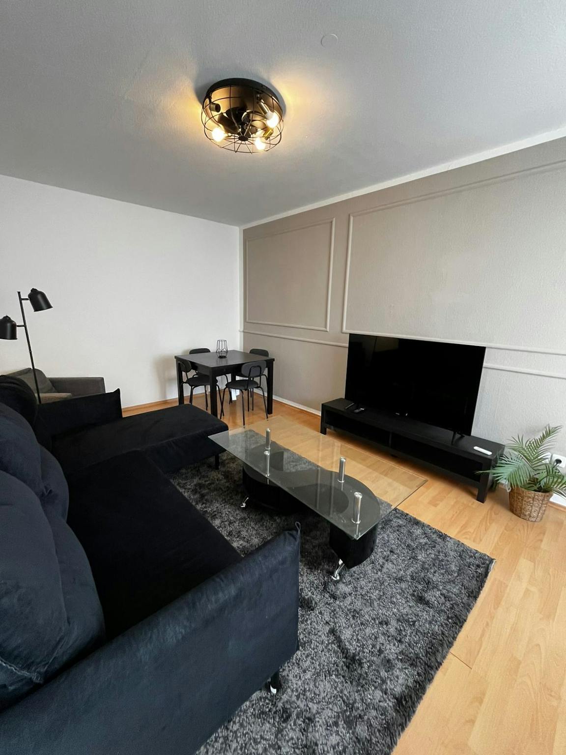 Im Wohnzimmer befinden sich ein Sofa, ein Tisch und mit Stühlen für Arbeit/Studium oder zum Essen, ebenso wie einen SMART TV (55 Zoll) für Deine Unterhaltung auf einer Fernsehbank.
