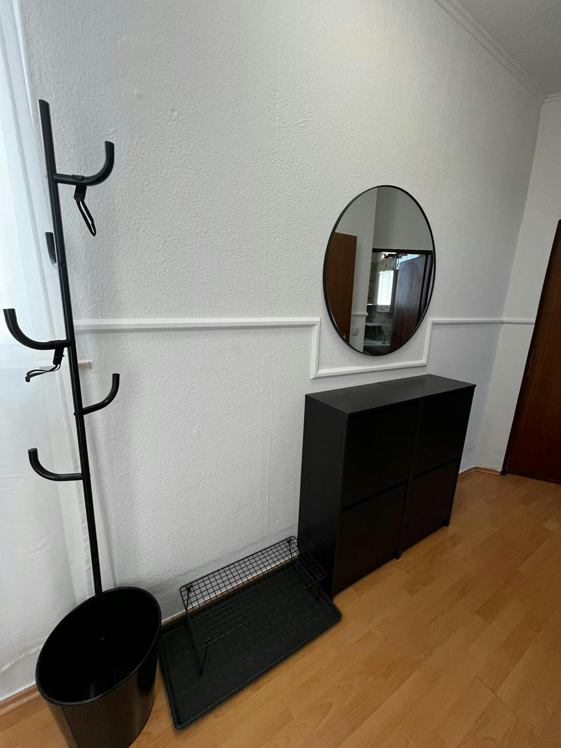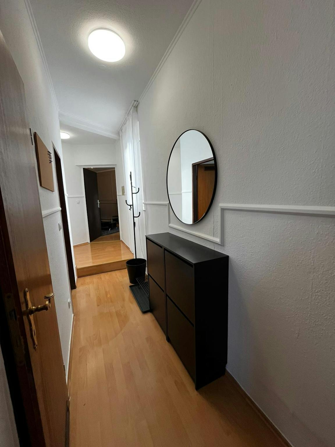 Im Flur findest du Schuhschränke und einen Spiegel.