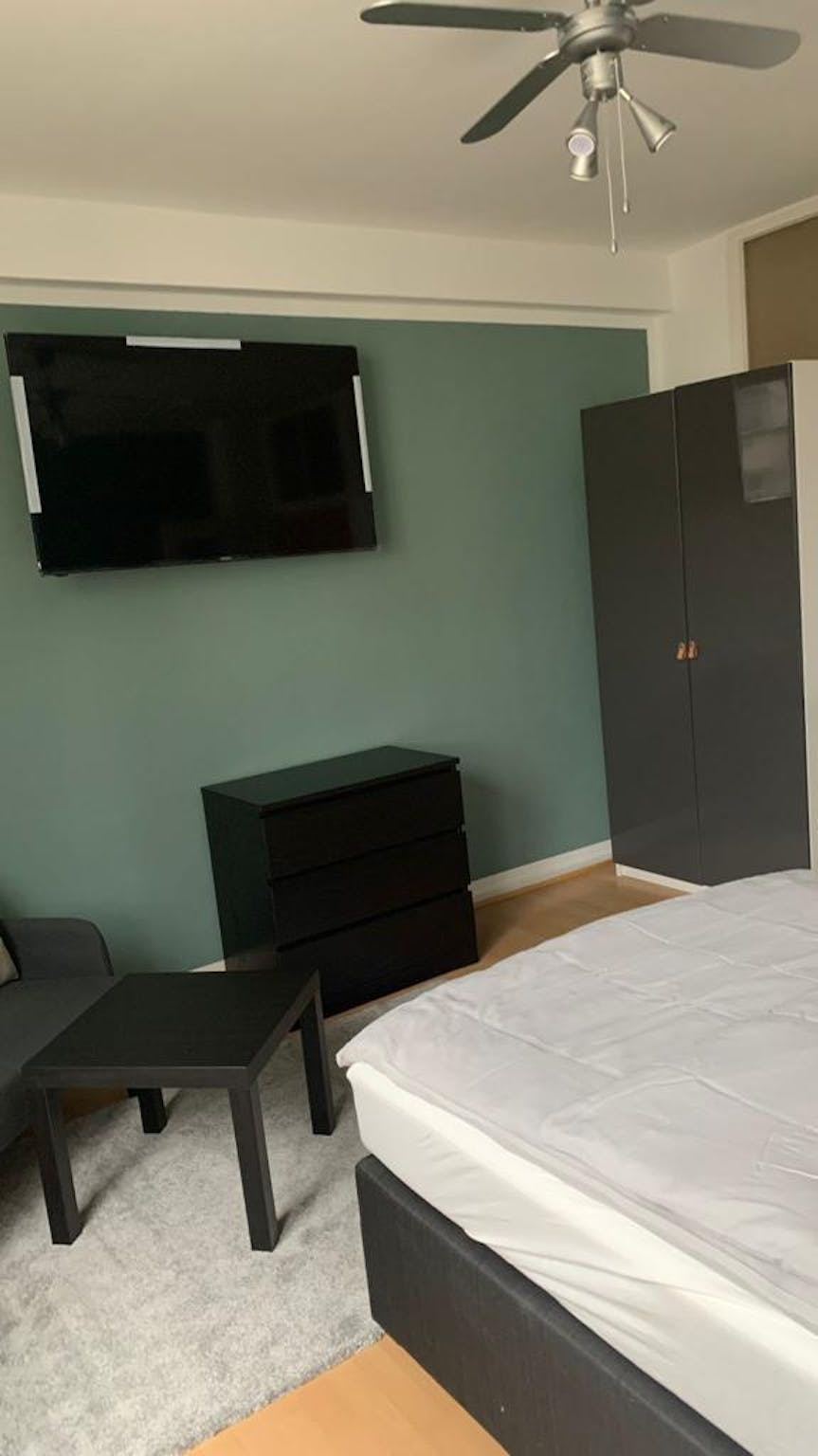 Außerdem findest Du einen Kleiderschrank für Deine Garderobe, einen Tisch und Stuhl für Arbeit oder Studium, ebenso wie einen SMART TV (55 Zoll) für Deine Unterhaltung. Die Küche ist perfekt, um hausgemachte Mahlzeiten zuzubereiten. Teil der Ausstattung sind Waschmaschine mit Trockner-Funktion und Spülmaschine.