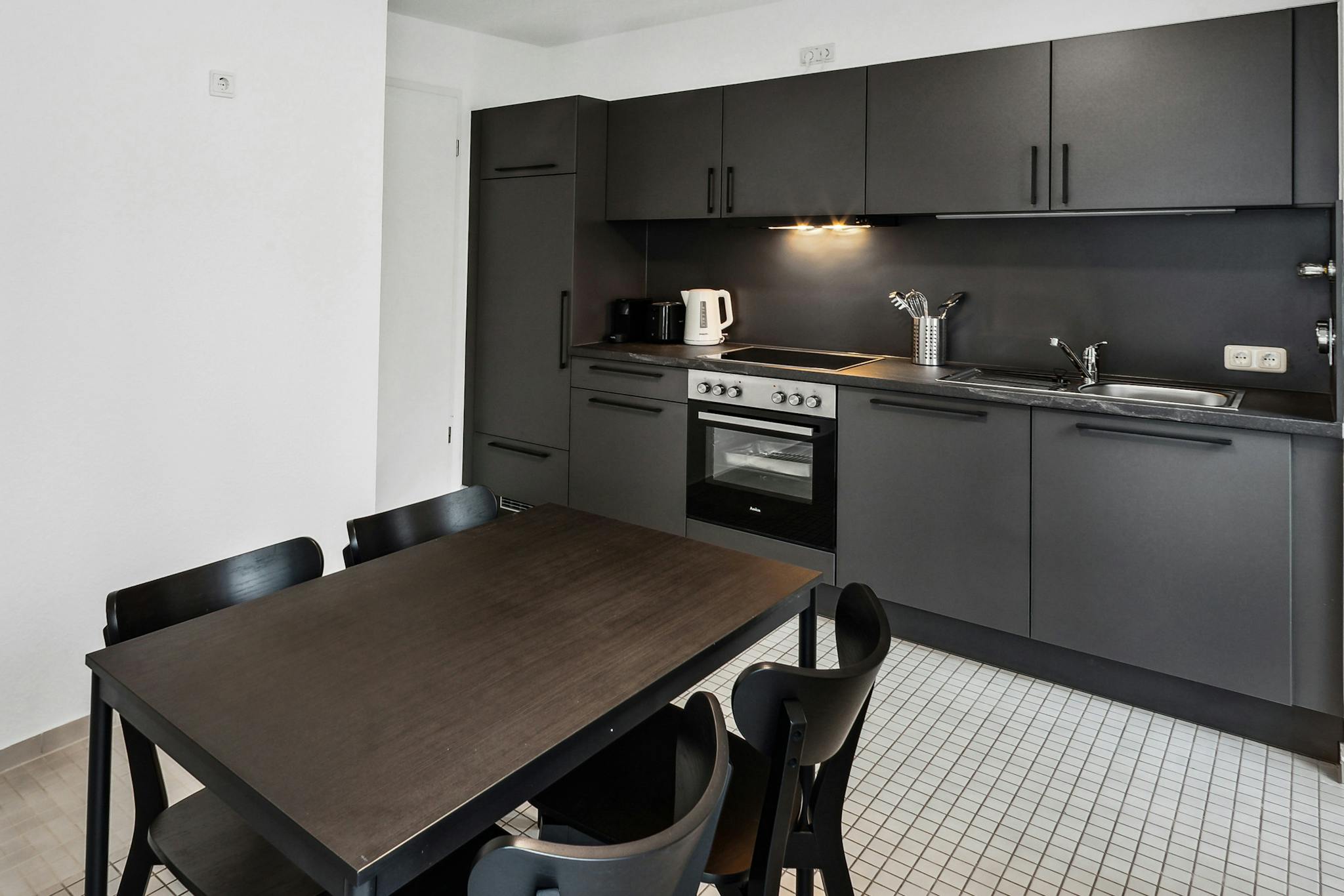 Our apartments come fully furnished with everything you need for a comfortable daily life, such as a bed with a premium mattress with bedsheets, pillows, and duvets, a large wardrobe, table, and chair for work with a lamp. Each flat as a spacious bathroom, and a fully equipped kitchen with everything from pans to a coffee machine, kettle and toaster.