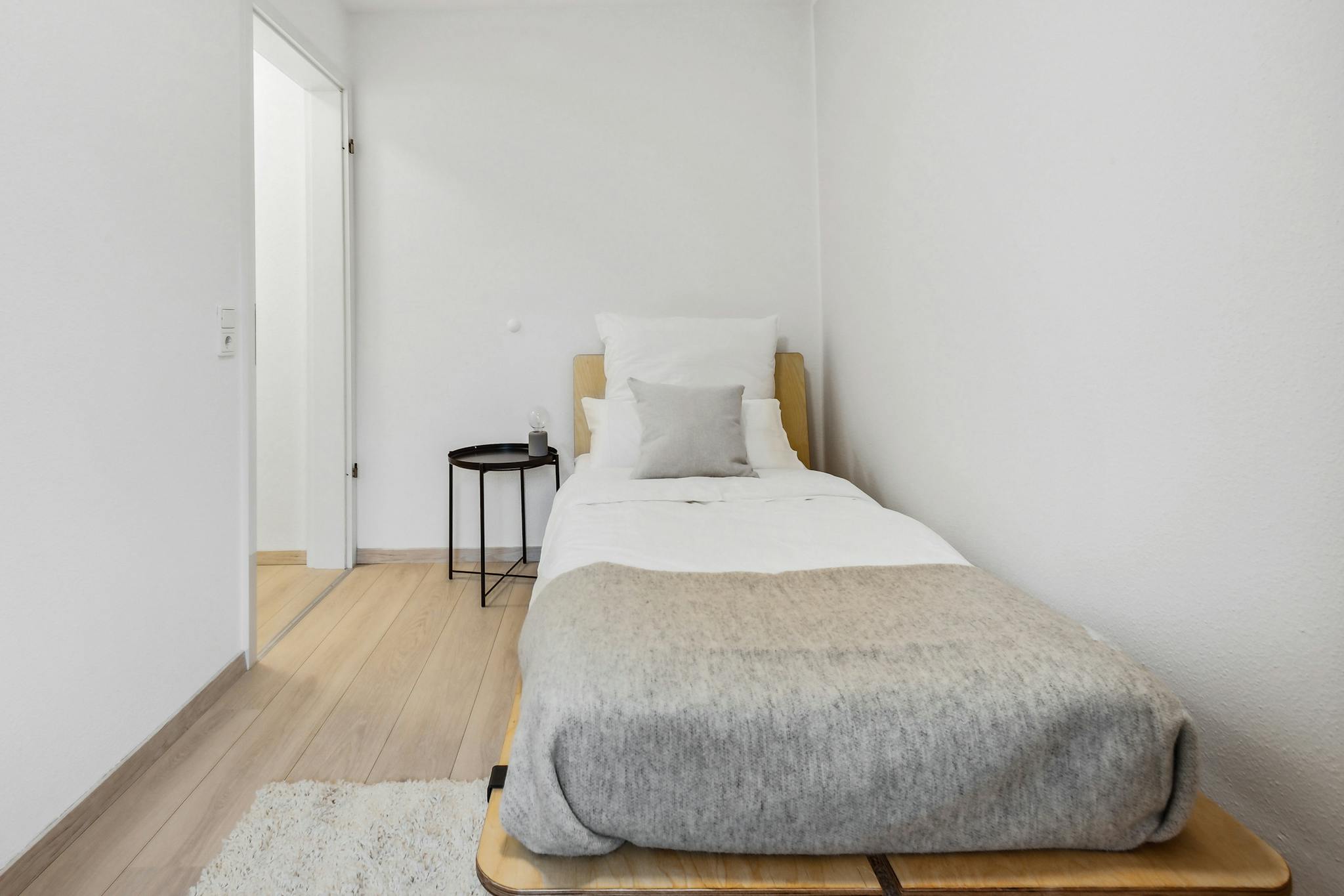 Our rooms come fully furnished with everything you need for a comfortable daily life. In the bedroom area, you will find a bed with a nightstand and lamp, as well as a large wardrobe. A premium mattress with a set of bedsheets, pillows, and duvets is also always included. To comfortably work or study from home, there is a table with a lamp and chair. You won’t need anything additional to settle in, and can arrive just your luggage at hand.