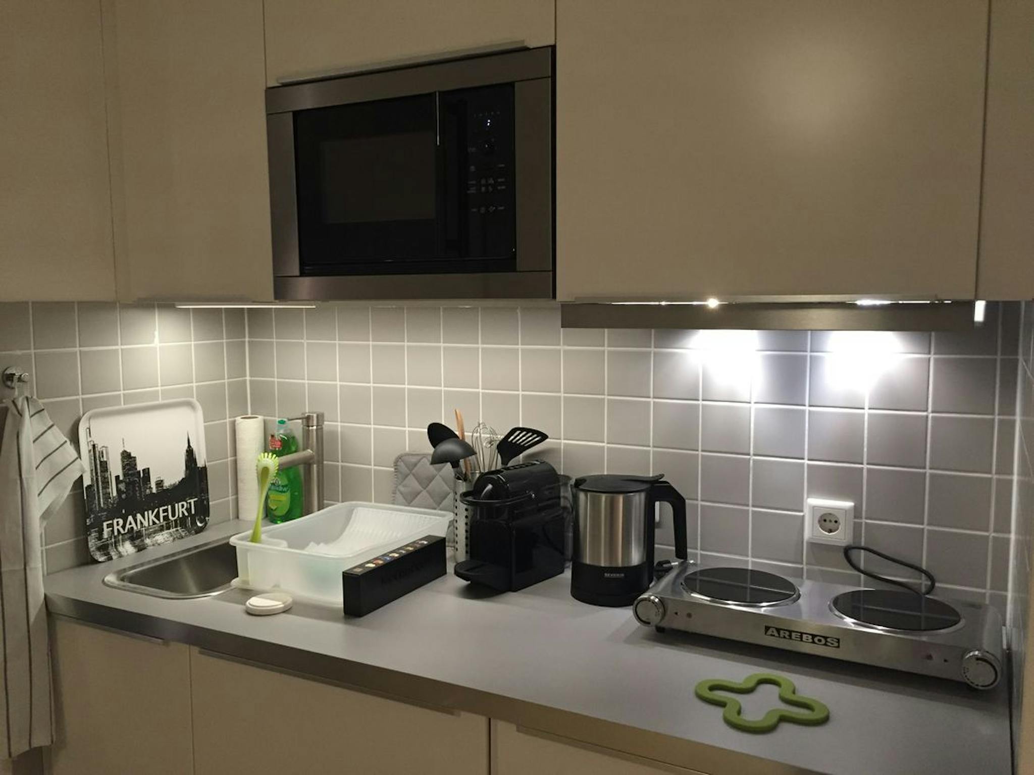 Die Kochzeile verfügt über Spüle, Mikrowelle,