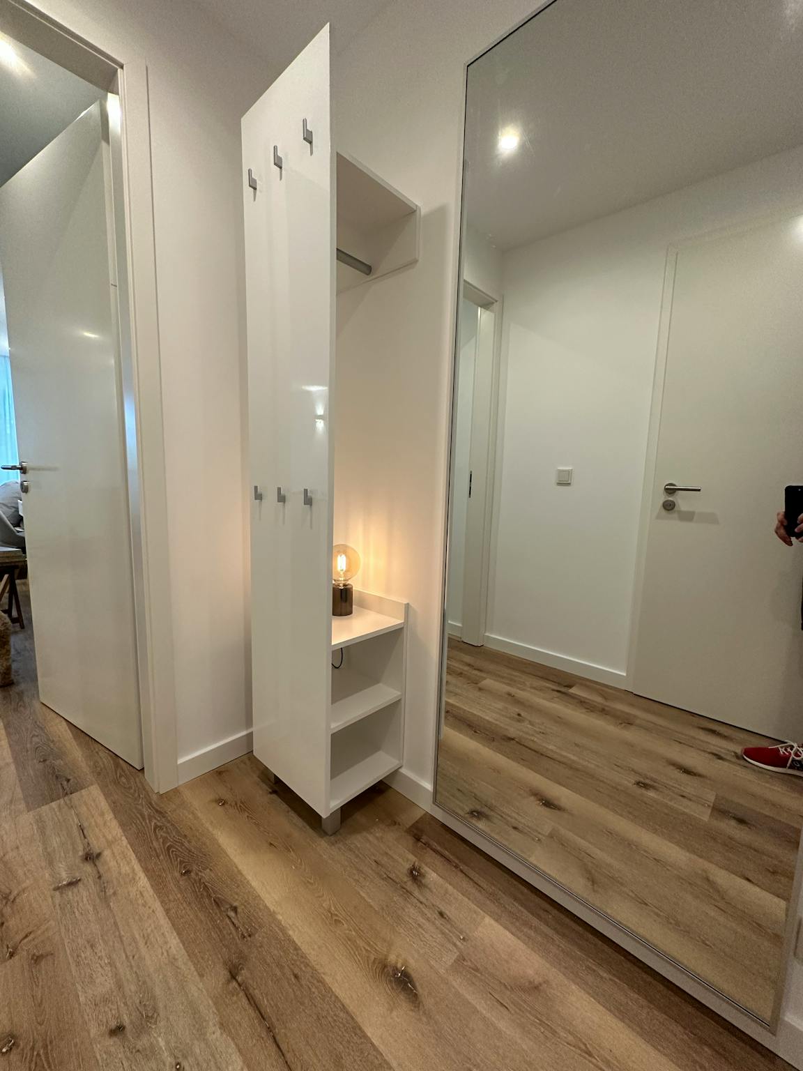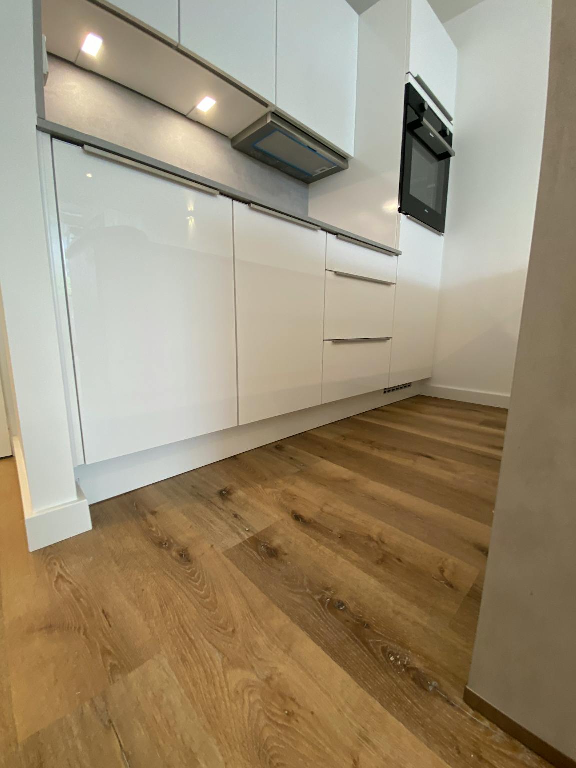 LED-Deckenspots, glatte weiße Wände und ein hochwertiger Bodenbelag verleihen der Wohnung eine helle und elegante Atmosphäre.