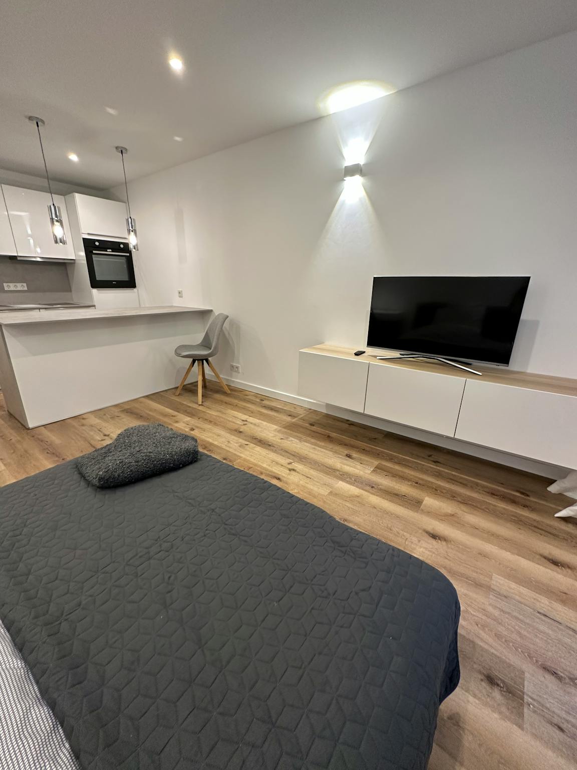 The LED spotlights, smooth white walls, and high-quality flooring give the apartment a bright and elegant atmosphere.