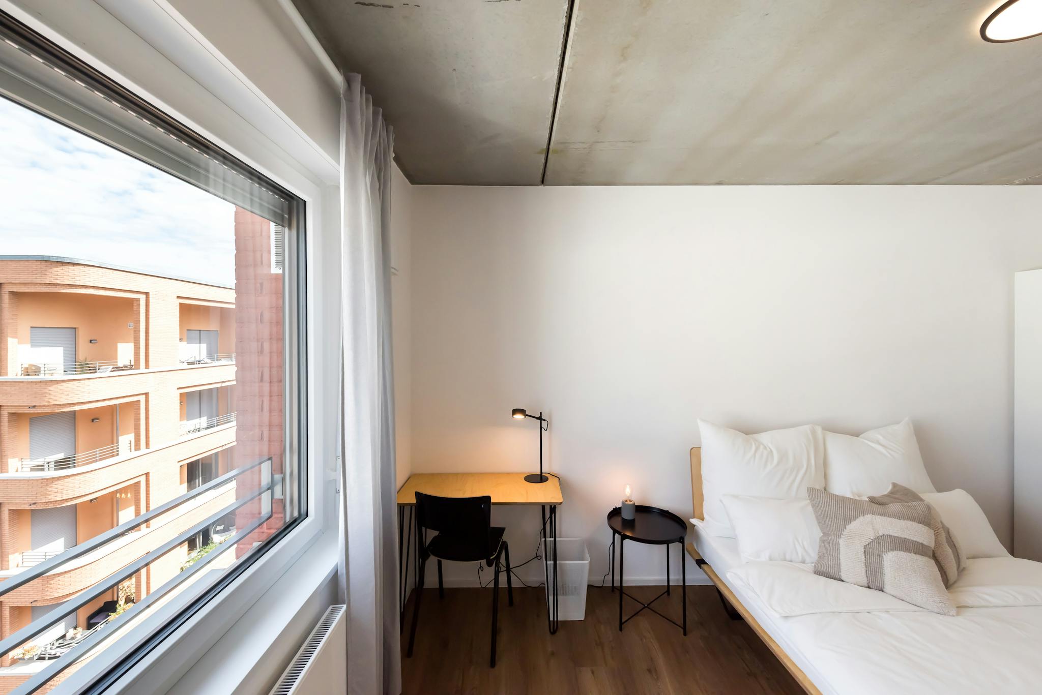 Our rooms come fully furnished with everything you need for a comfortable daily life, such as a bed with a premium mattress with bedsheets, pillows, and duvets, a large wardrobe, table, and chair for work with a lamp. Some rooms also have a private or shared balcony or terrace for you to enjoy the sunshine.