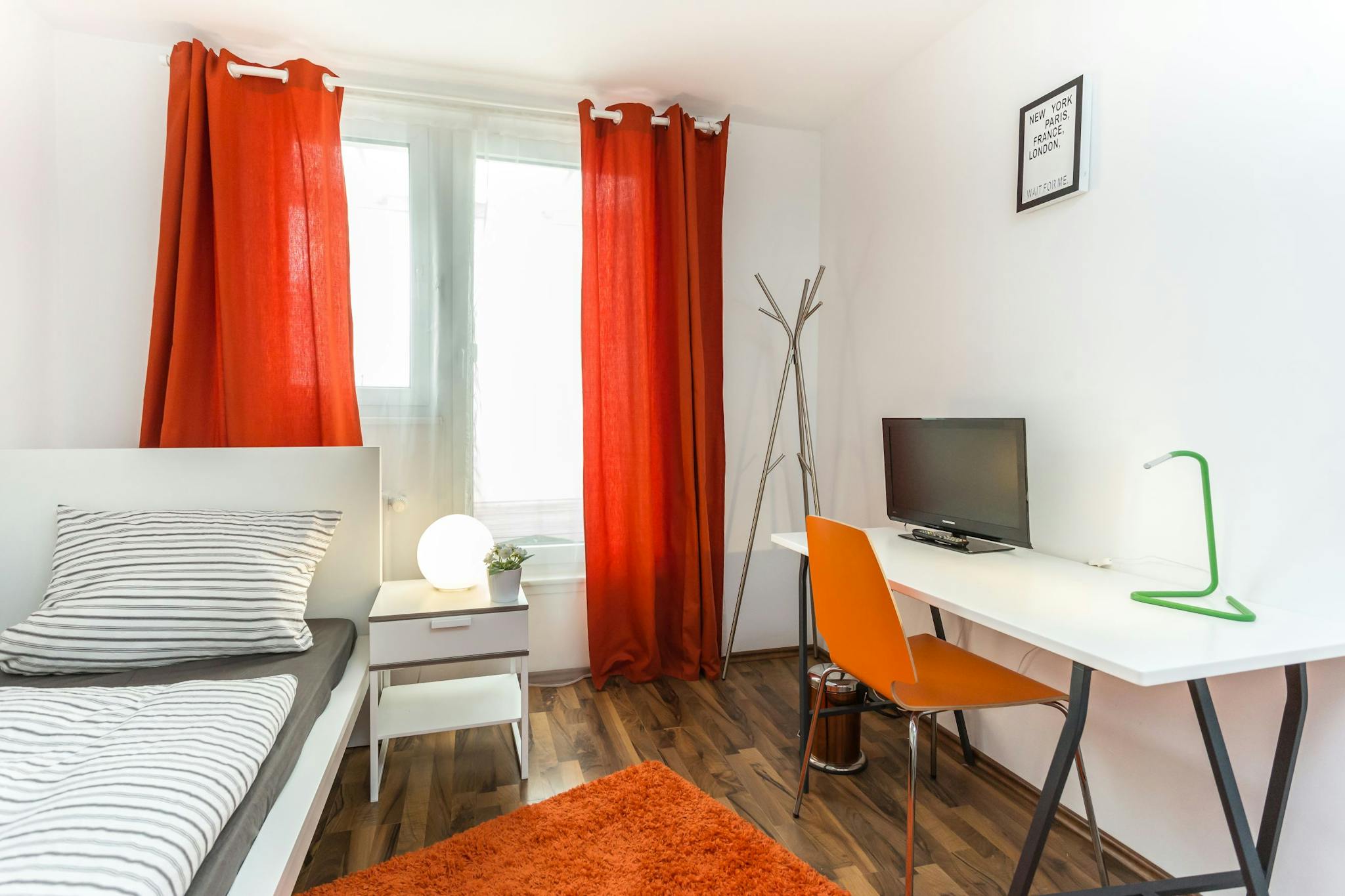 The rooms are modern furnished with bed incl. bedclothes, wardrobe, desk, chair as well as small TV and also free wifi access.