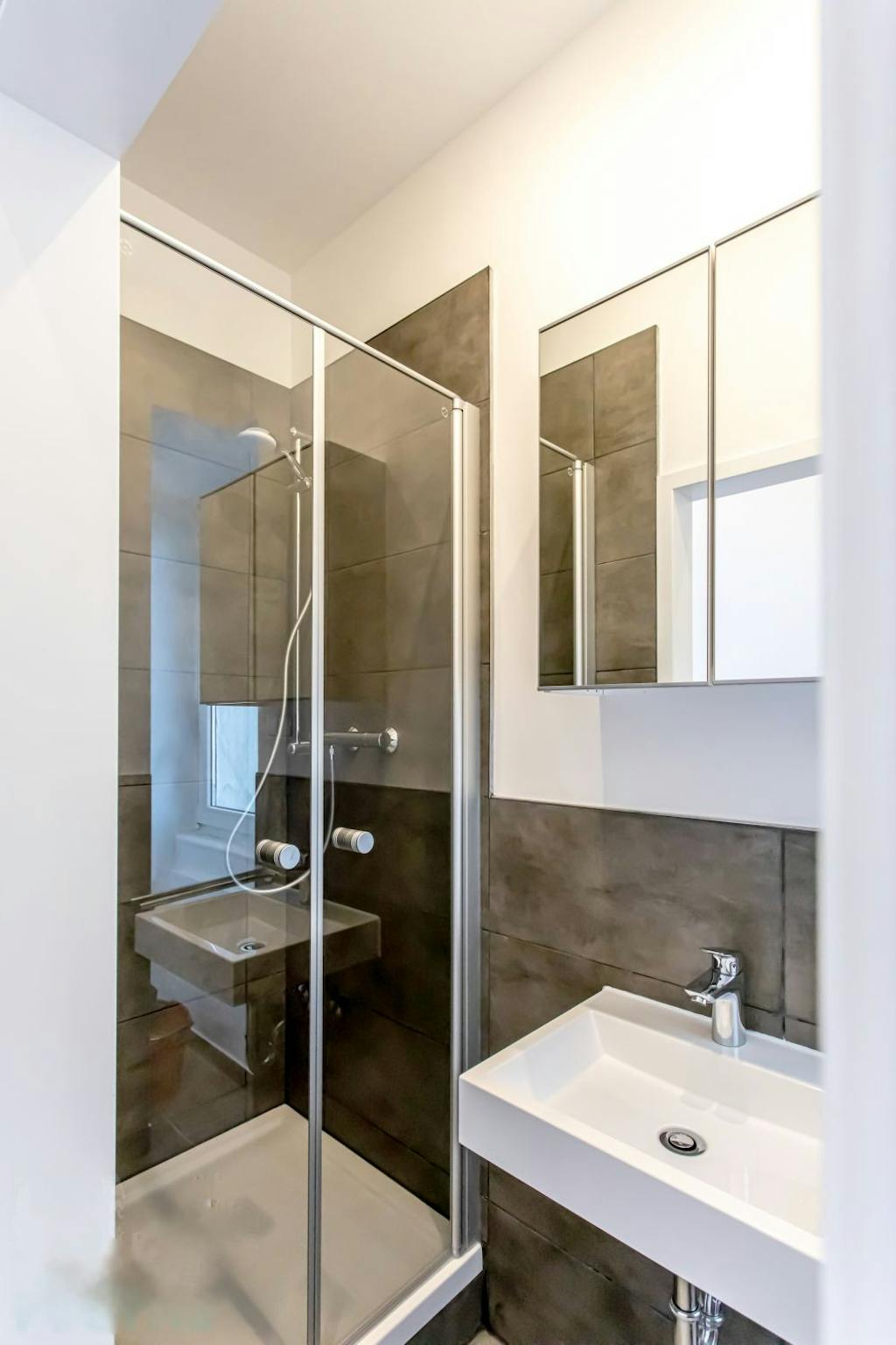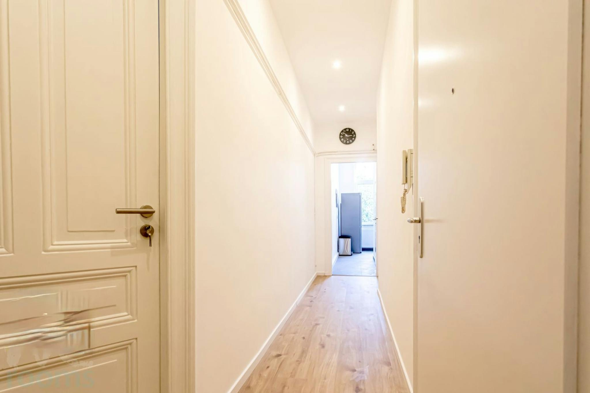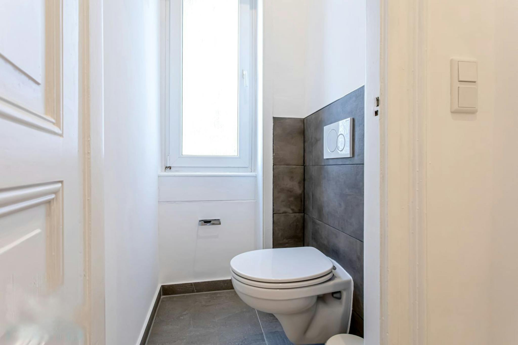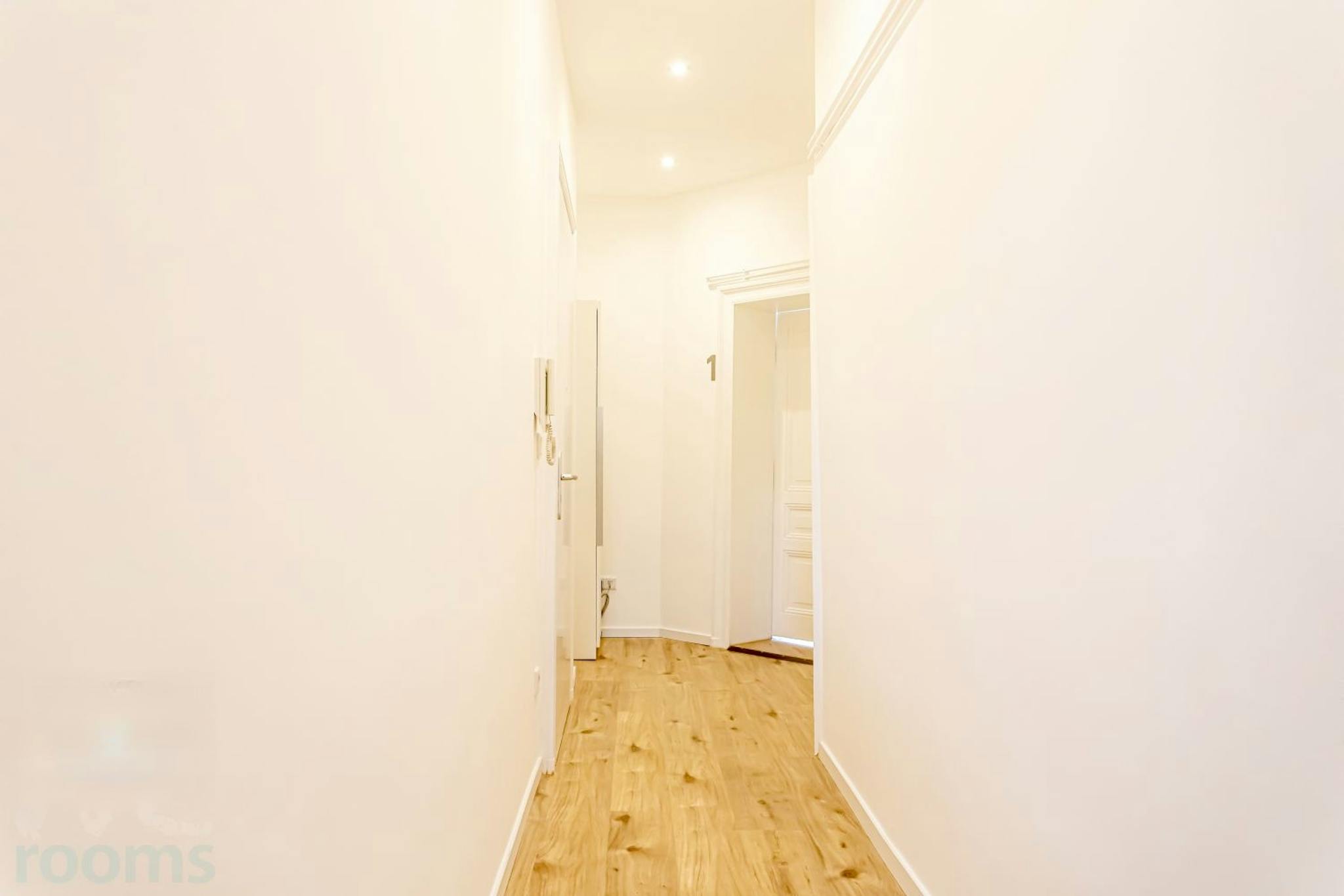 The floor is lined with high quality oak parquet and the walls are smooth white plastered. The bathroom is of modern concrete look and equipped with shower for the 2 residents for common use. The toilet is located in a separate room on the opposite side of the hall.