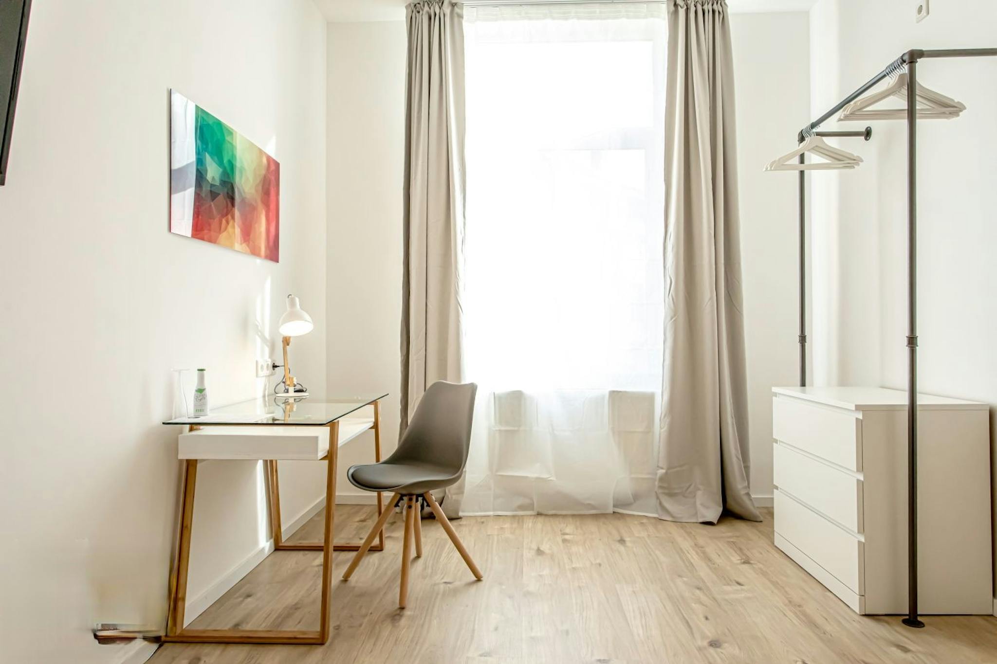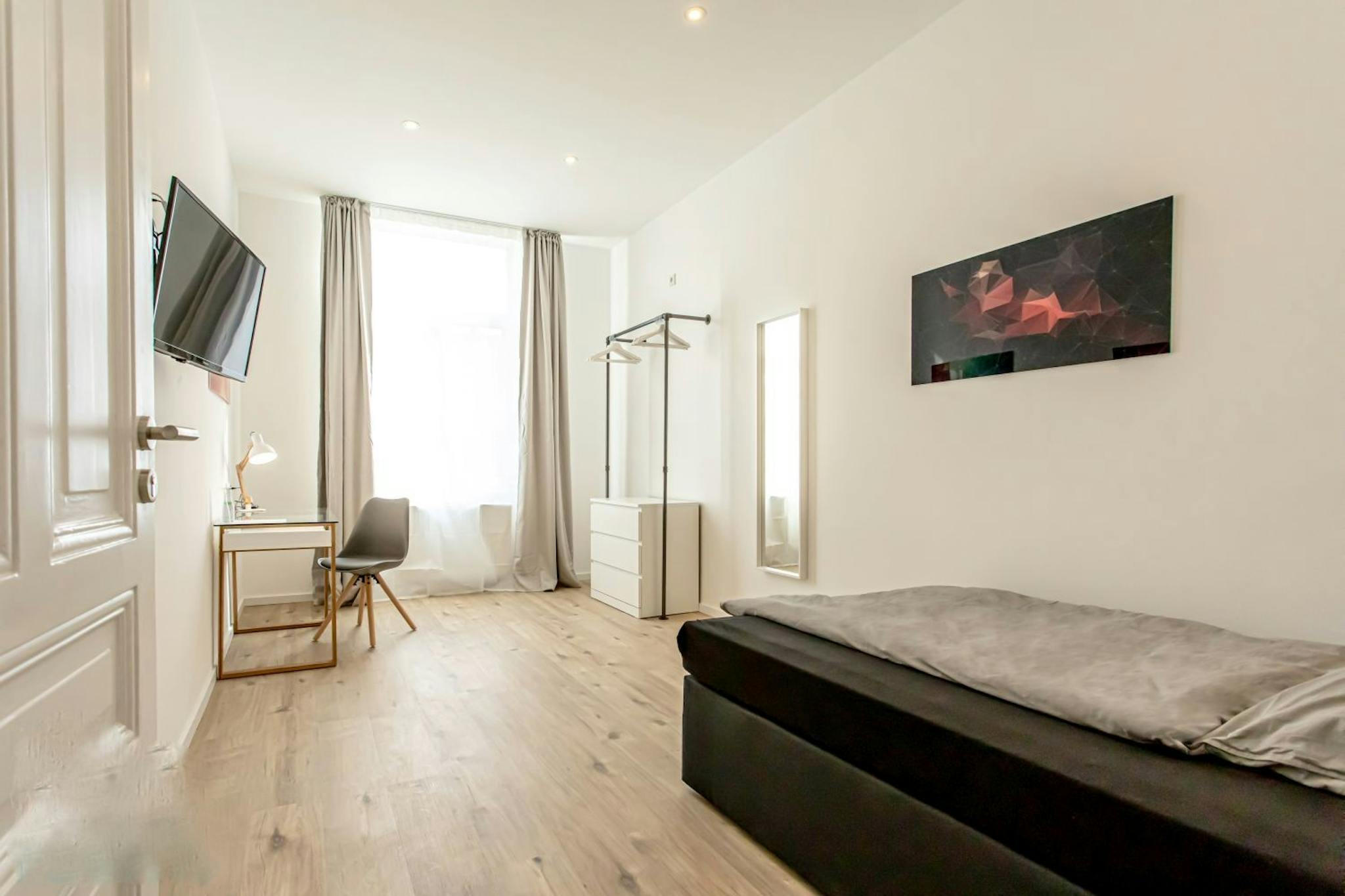 Die komplett möblierten Schlafzimmer verfügen über eine gehobene Ausstattung. Zur Ausstattung des Zimmers gehört ein 1,40m Boxspringbett, Kleiderschrank, Schreibtisch, Sessel, Spiegel, Fernseher und Wohnaccessoires. Kostenloses W-LAN in der gesamten Wohnung ist ebenfalls inklusive.