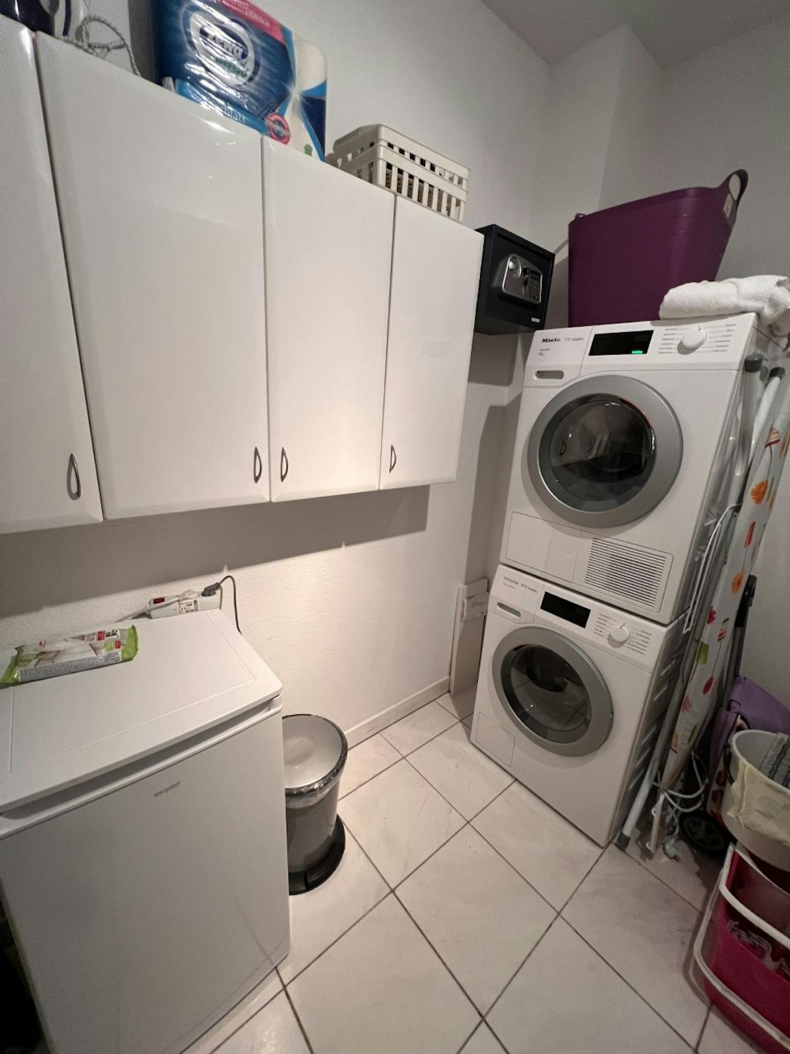 The washing machine and dryer are in a utility room beside the kitchen. There is also a spacious fridge and freezer.