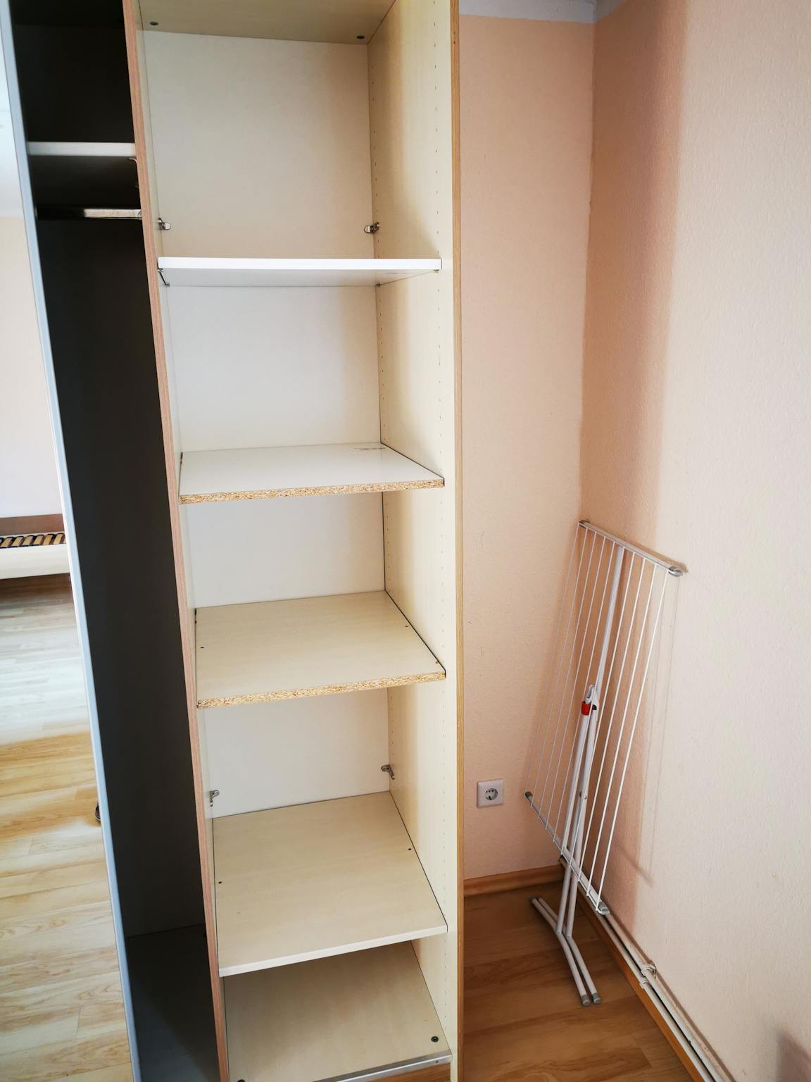Zur Zimmerausstattung gehört weiterhin (wie auf den Fotos zu sehen): geräumiger Spiegel-Kleiderschrank, kleiner Garderobebereich, Schuhablage, Schreibtisch mit Bürolampe und Rollsessel, Nachttisch mit Lampe, Stehlampe mit hellem LED-Licht, aufrechtes Regalmöbelstück (schicker aber empfindlicher Glanzweißlack), sowie das eine oder andere liebevolle und/oder praktische Extra.