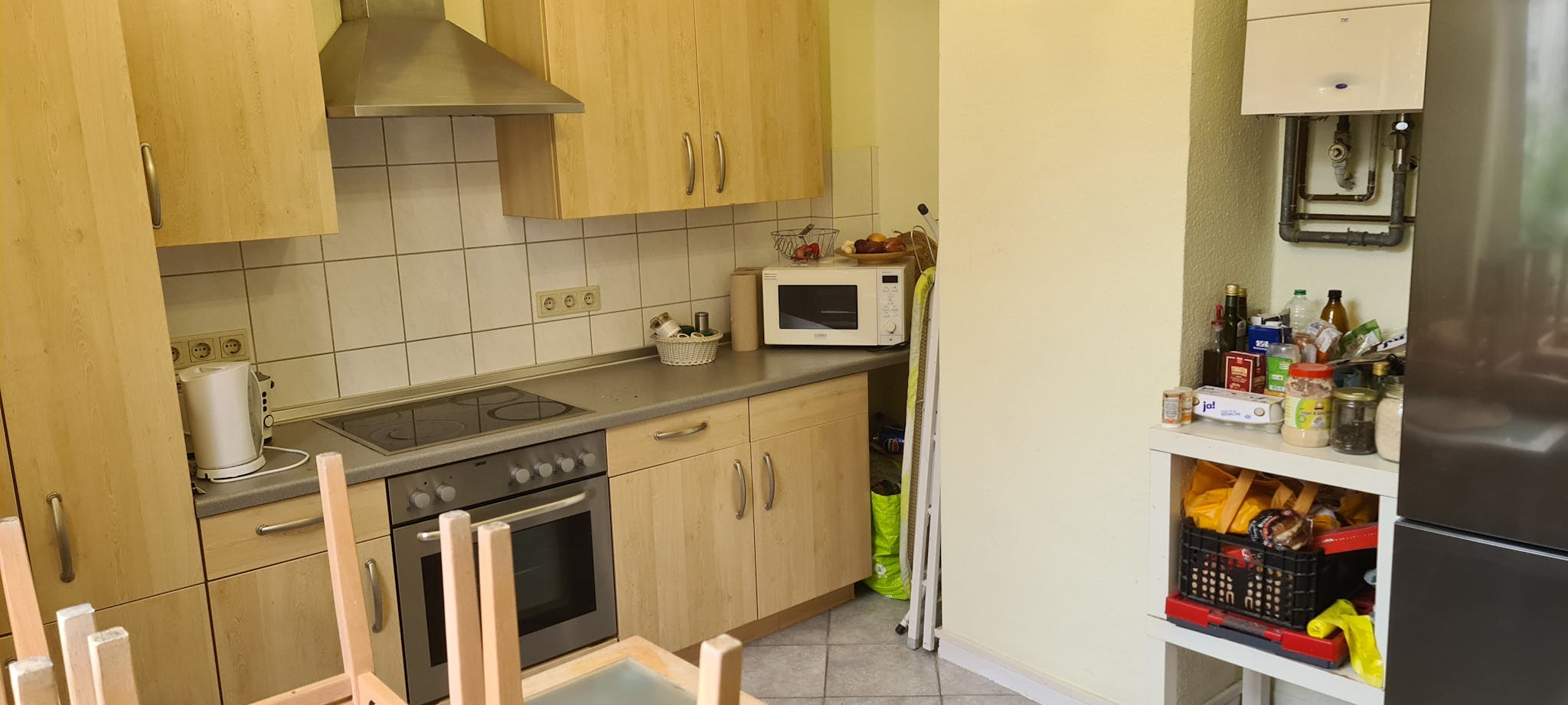 Die gemeinsame Einbauküche ist mit allgemein erforderlichem Hausrat versehen, auch mit einem Bügelbrett (ohne -eisen jedoch). Alle insgesamt drei Flatmates haben in der Küche nebst einiger gemeinsamer Stauräume auch ihre eigenen Vorratsschubladen und -Fächer. Große Kühl-/Gefrierkombi mit 3 Tiefkühl-Schubladen (eine pro Zimmer).