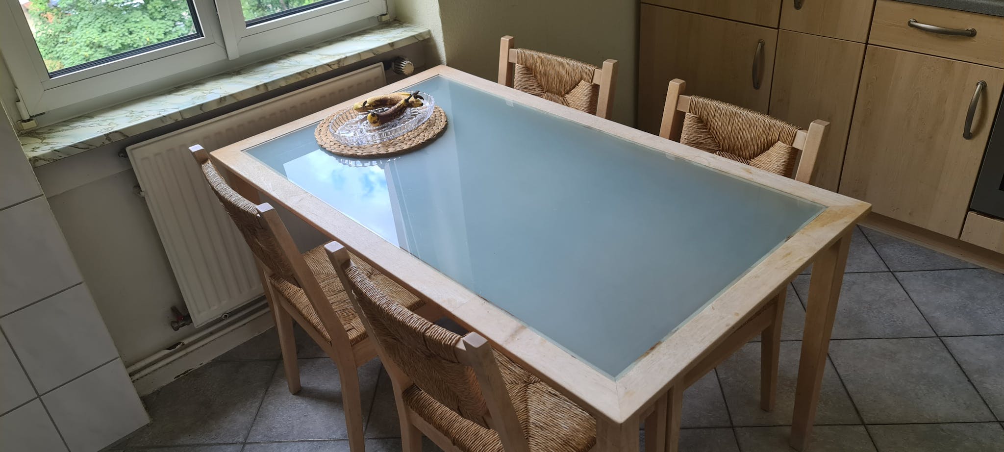 ▪︎ Wohnküche mit Waschtrockner, Spülmaschine, großer Kühl-/Gefrierkombi sowie mit zusätzlichem, eigenem Kühlschrank auf Anfrage, Elektroherd mit Ceranfeld und Ofen, Holz-/Glastisch mit 4 Stühlen, zahlreichen Fächern, Schubladen und Regalen